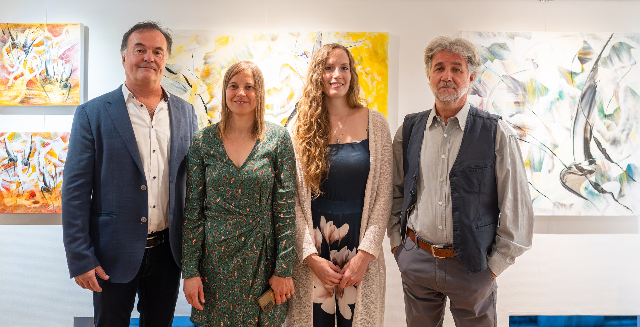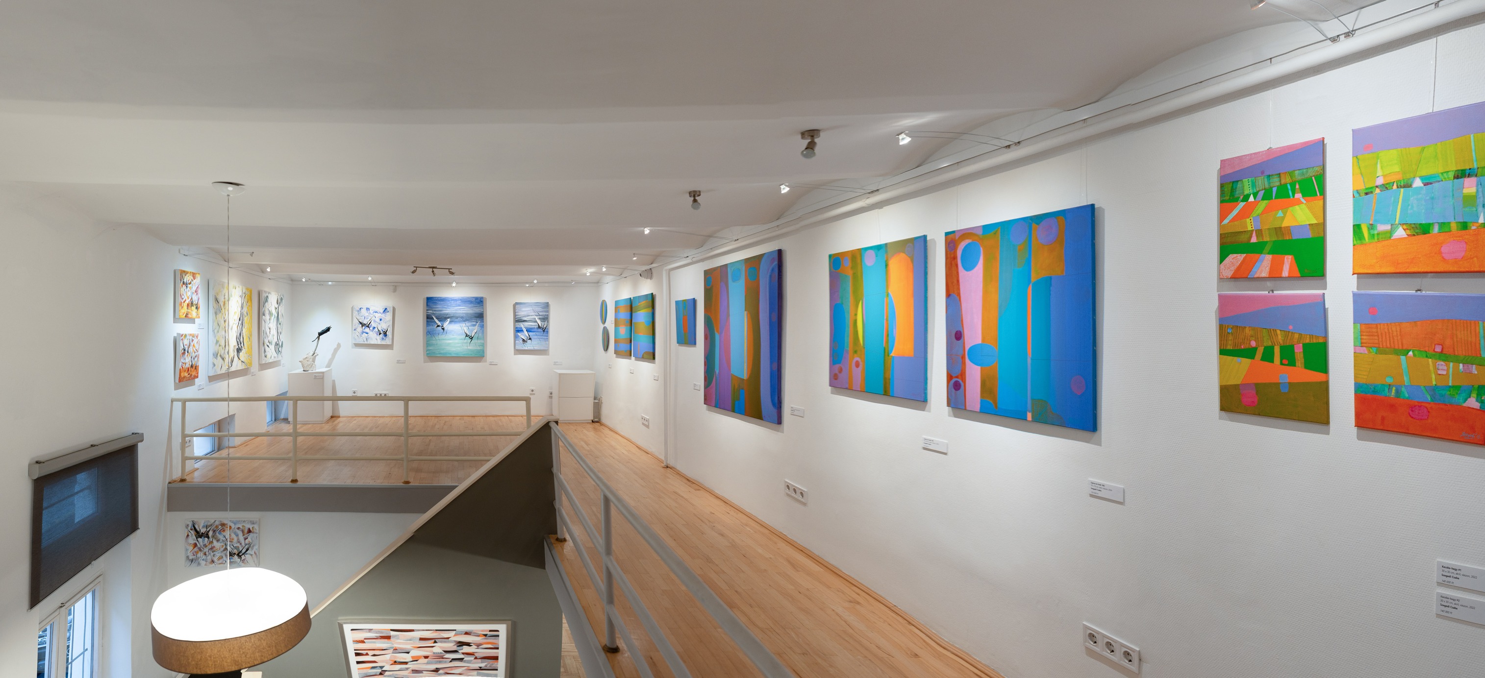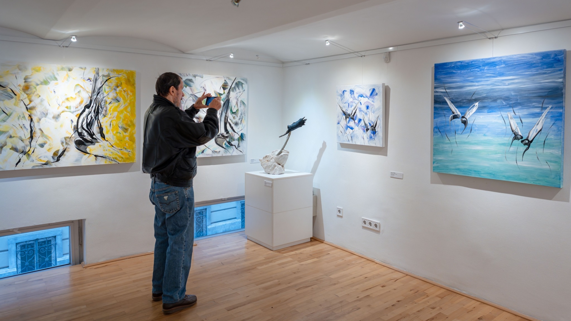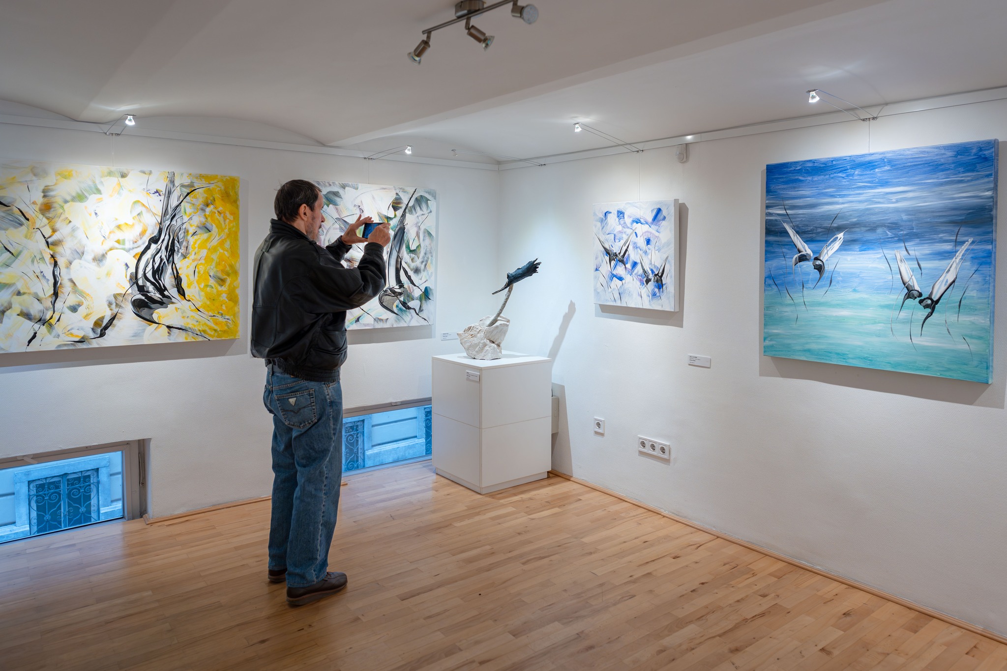 Ha már lélekben szárnyalunk, érdemes a térben is feljebb sétálnunk egy emeletet, ahol megint csak egy különleges alkotói világba csöppenünk. A magát koloristának valló Szegedi Csaba festményei előtt akaratlanul is felenged az ember, és azon kapja magát, hogy önfeledten dúdolgatja az Anima Sound System kétezres évekbeli slágerét. Hogyan őrizhető meg és tehető félre szűkösebb időkre valami, ami valójában nagyon is illékony? „Tedd a napfényt be a számba”. Ilyen egyszerű lenne? Nos, a belső napfény konzerválásának mindenesetre igen egyedi módját láthatjuk Szegedi Csaba Ciprus és hold, Pelso, valamint Kecske-hegy című sorozatán. Szegedi a számára inspirációt jelentő tájat - legyen az mediterrán, balatoni vagy akár „kisvárosi” (lásd a Móri Művésztelep dimbes-dombos, szőlőtőkés panorámáját) - szétbontja, majd elemeit játékosan elbújtatja absztrakt, konstruktivista vonásokat mutató festményein, hogy az általa kiragadott részletek végül hatalmas narancsos-lilás-türkiz robbanásban találjanak utat a néző szívéhez, és ott álljanak össze ismét egy egésszé. Annyi bizonyos, hogy ezeken a képeken, bárhonnan is tekintsünk rájuk, a felhők felett mindig süt a nap.