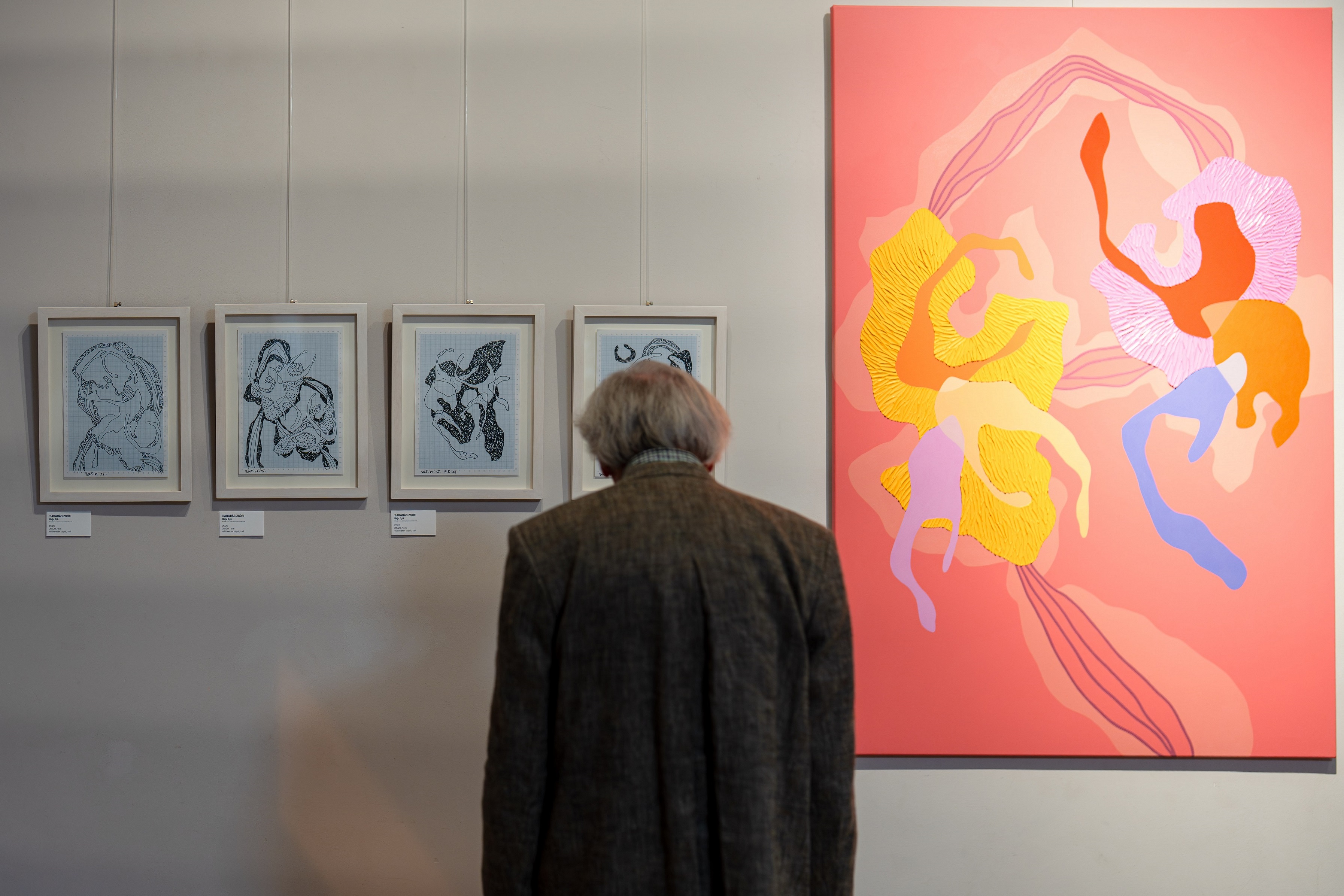 A még és a soha között valami időn kívüli határhelyzetre utal. Arra a pontszerű pillanatra, amikor valami éppen születik vagy éppen eltűnik, de még egyik sem teljesen igaz. Barabási Zsófi alkotásán a rózsaszín tér nem háttér, hanem légkör: puha, mégis sűrű közeg. A színes alakzatok mintha ugyanannak az érzetnek különböző állapotai lennének. Felülnézetből látszódó emberi szituációk. A kompozícióban nem érezhető hierarchia, a tekintet szabadon sodródik a vonalak, rétegek, színtestek harmóniájában.
