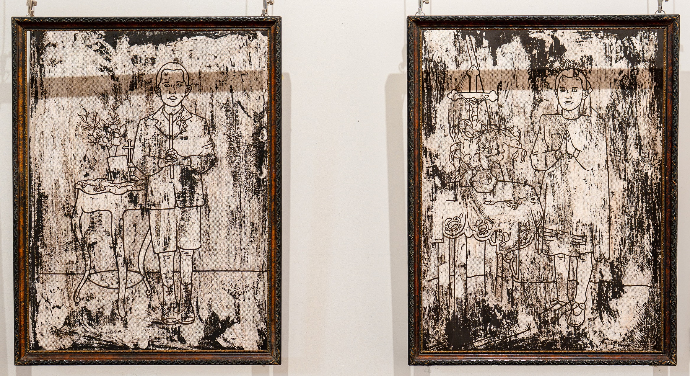 A következő terembe érve Reining Vivien nagymamája és testvére elsőáldozási fotói nyomán készített képek párosa látható. A keret a megszokottakkal ellentétben nem a képekre feszül, hanem előttük lóg, így azoknak önnön árnyékai válnak a valódi keretekké. A régiség varázsával játszik a kompozíció: a csipketerítő, a virág az asztalon, a gyermeki testtartás. Az Áldozás I. és II. az emlékezés csendes liturgiája.