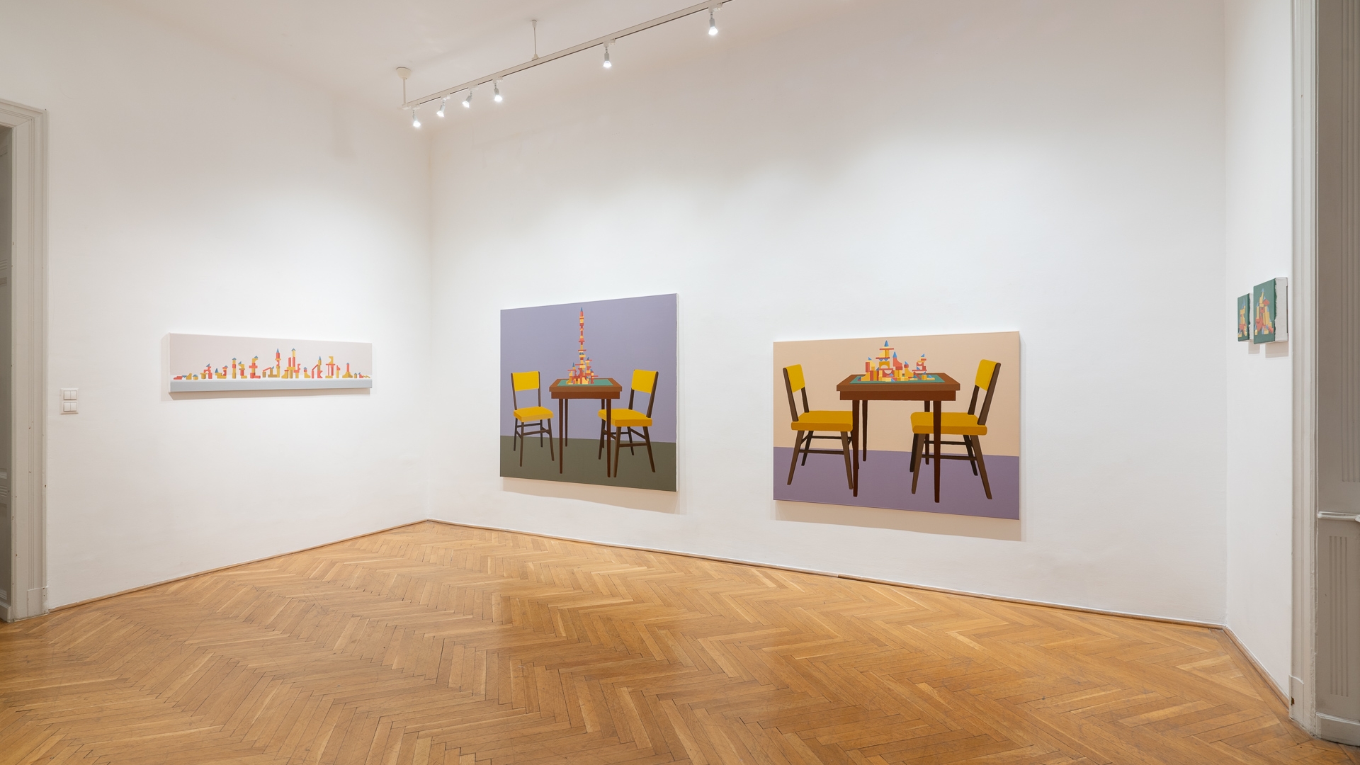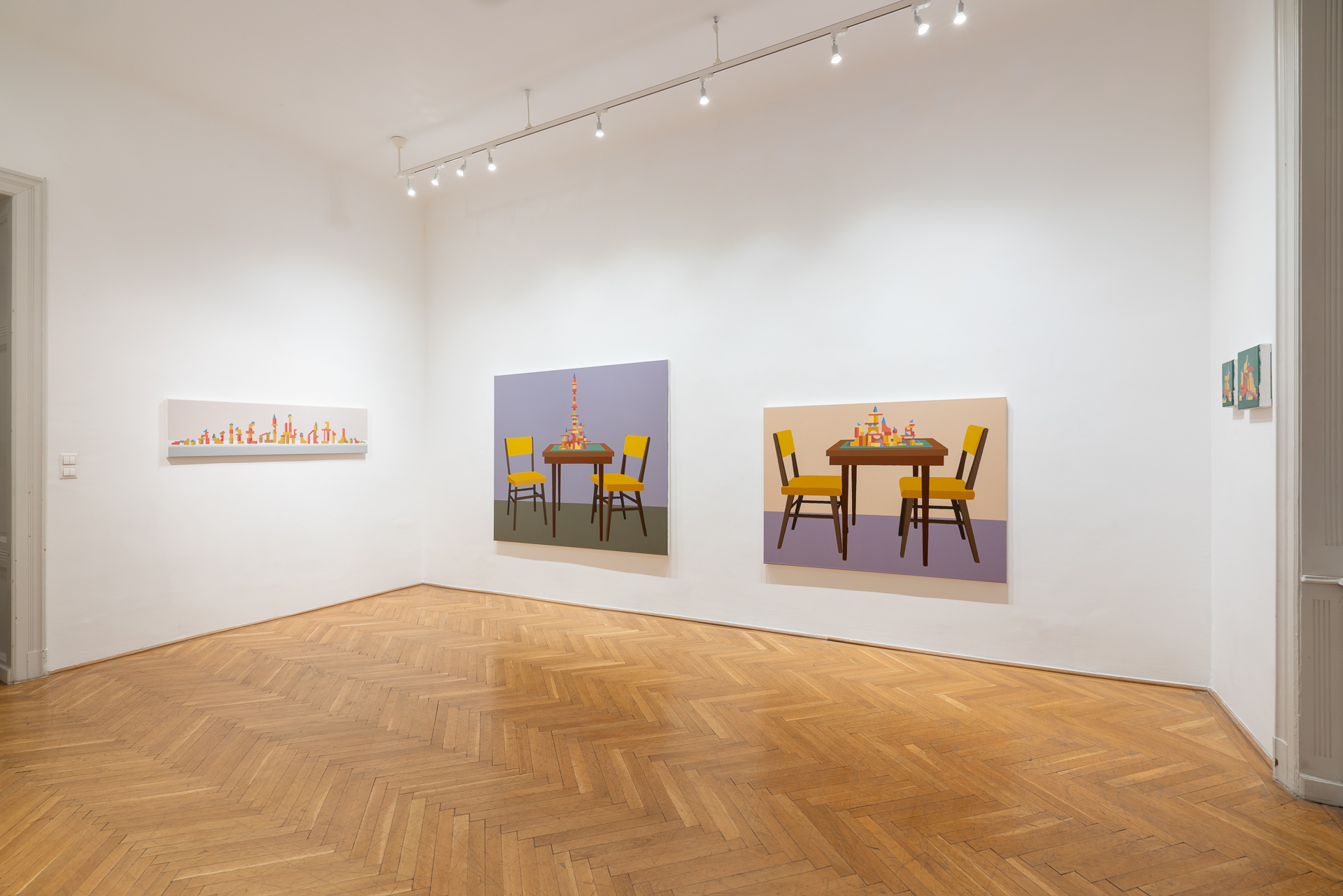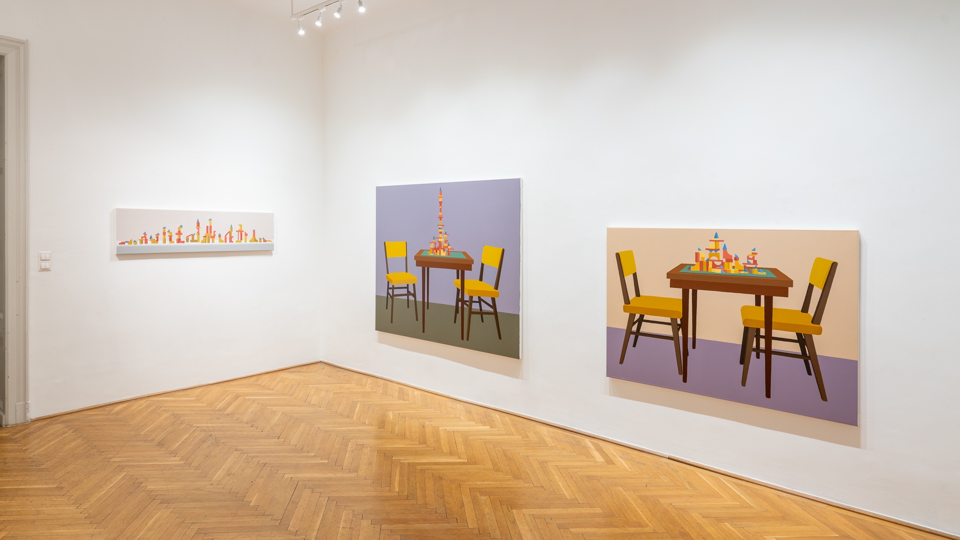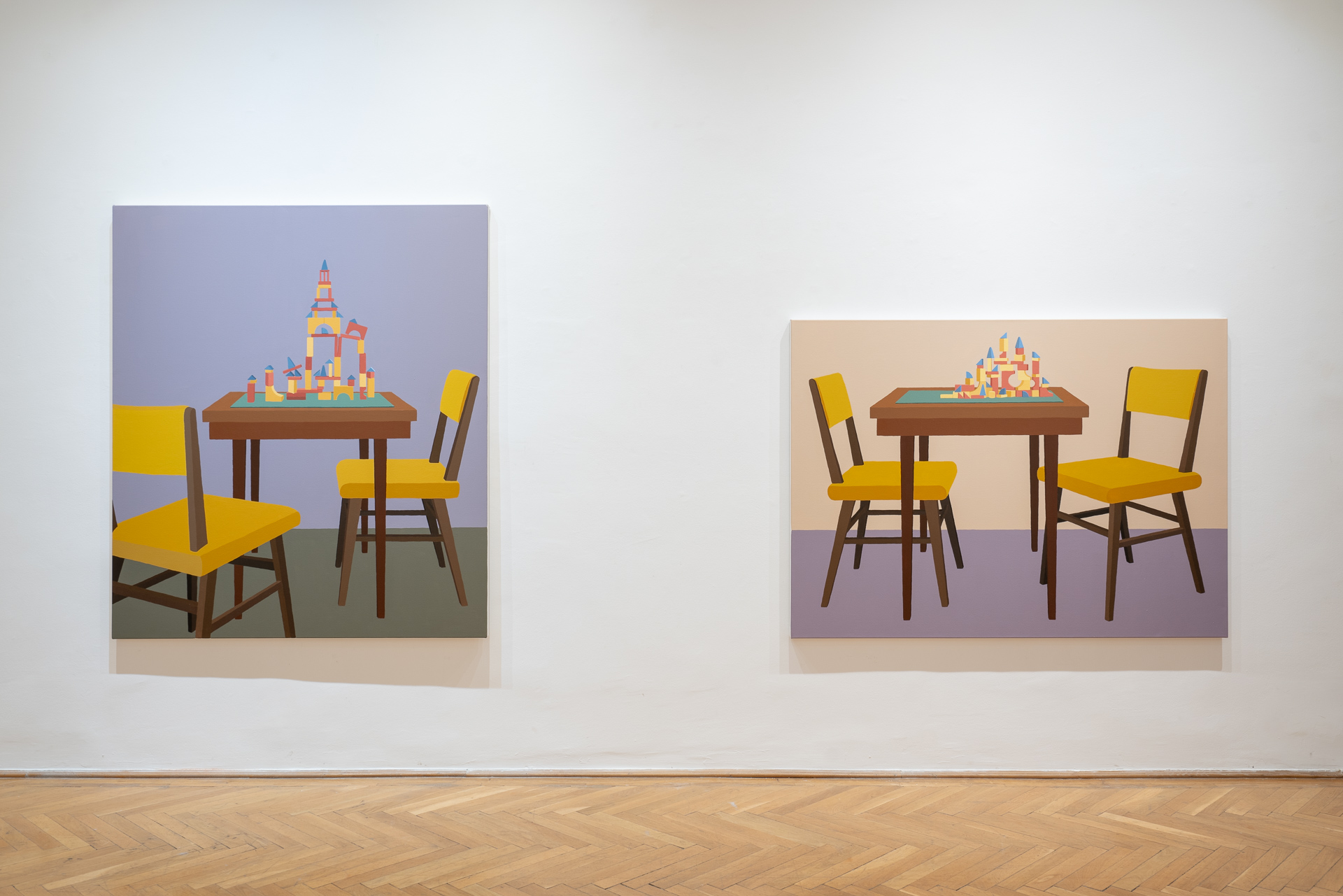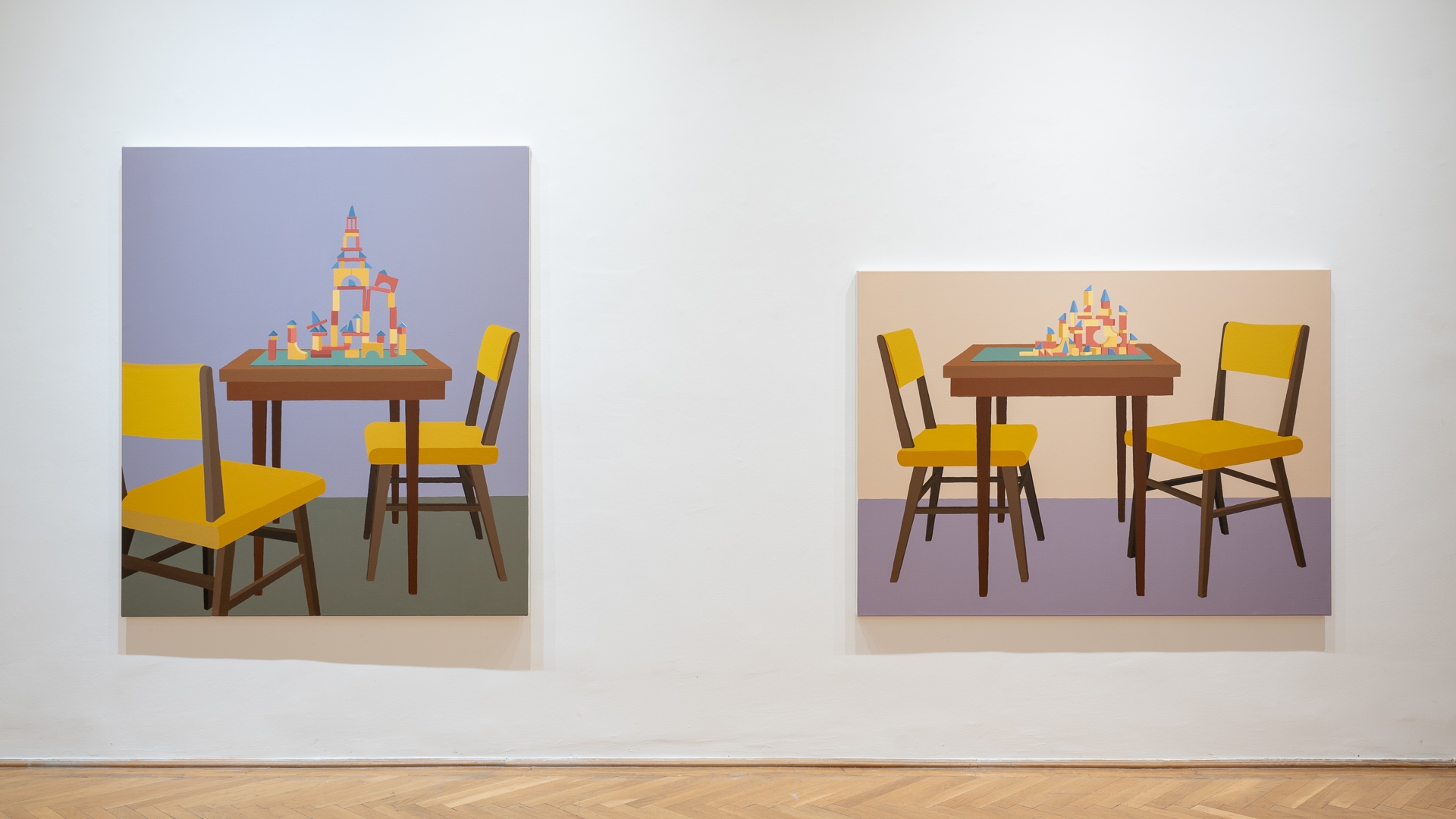 A képeken látható belső terek kiüresedett, ember nélküli, de emberi jelenléttel telített tájak. Csendes, elhagyatott terek, olyan szobák, ahol valaki valaha jelen volt, de most már csak a nyoma maradt. A székek mégis mintha alakokat idéznének: két jelenés, két egymás felé forduló test, amelyek között ott feszül valamiféle kapcsolat. Az asztalon álló építmény a mozdulat emlékét őrzi. Bár elsőre a csend uralja a kompozíciókat, a rend mögött ott rejtőzik a szétesés zaja. E törékeny határ – a mozdulatlanság és mozgás, a rend és bizonytalanság közti feszültség – teszi élővé ezeket a festményeket.