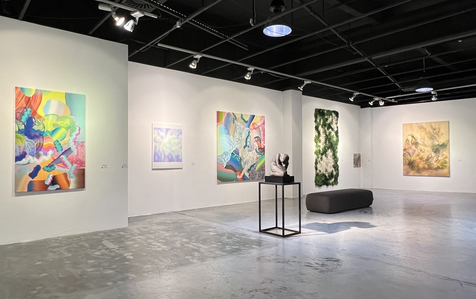 A Kontempláció plasztikájával szemben láthatjuk Szakál Éva és Vető Orsolya Lia munkáját. Szakál akrillal vászonra festett #00F12 (2022) meditatív kompozíciója organikus formákat vonultat fel, pontosabban, hagyja, hogy azok ide-oda áramoljanak. A címbeli hashtag (kettő kereszt) a digitális kultúrára utal, a kép pedig az érzékelésünkkel, a színekkel játszik. Vető Orsolya Liquid Slices of Time (Risky) (2023) című munkája koloritban tobzódik:elsősorban a kék árnyalatai dominálnak, de lila, rózsaszín, sárga és fehér, liquid formái is élettel teliek.