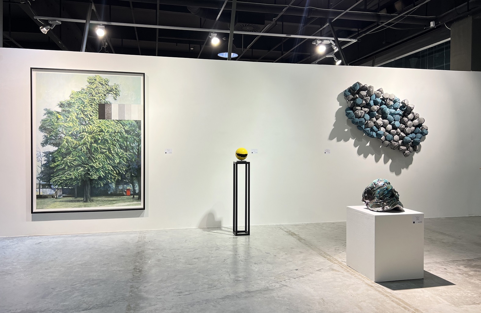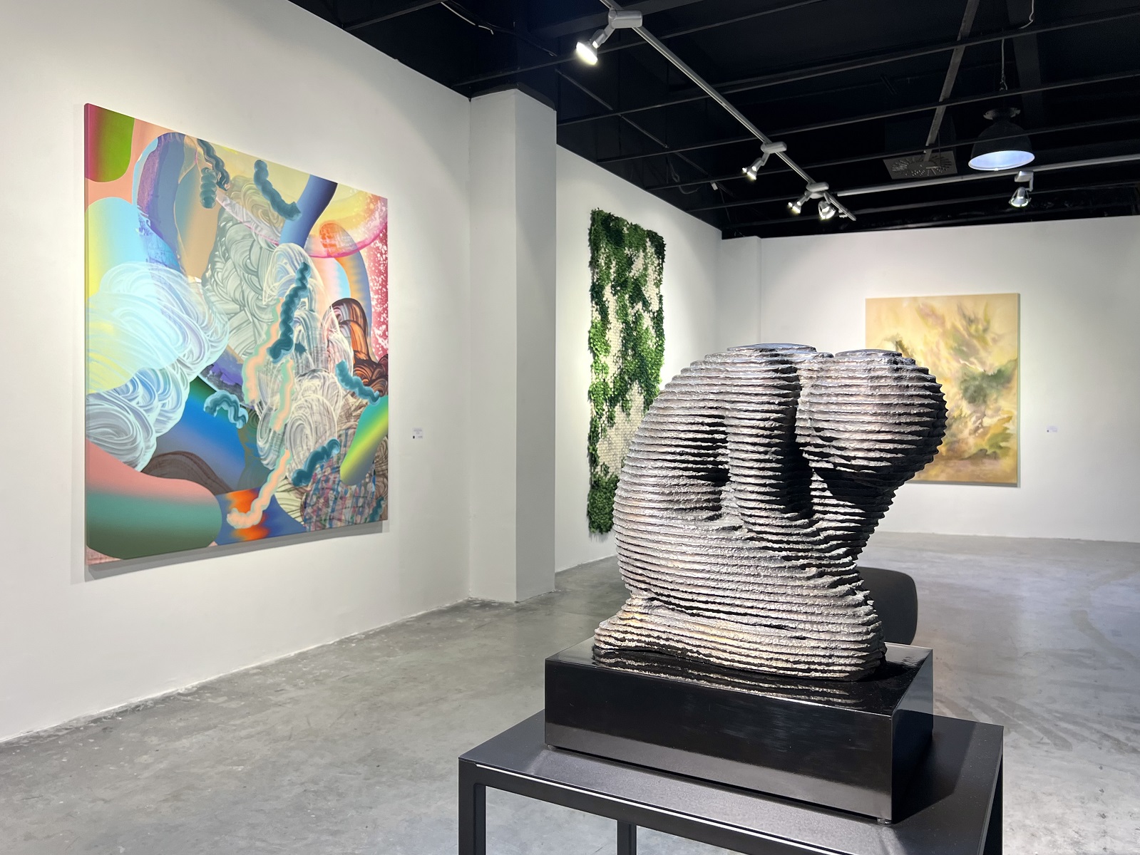Nem pusztán a műalkotások színvilága miatt izgalmas a tárlat, hanem az anyagok és témák sokszínűsége miatt is. A változatosság már a térbe történő belépéskor érzékelhető. A bejárattól cirka tíz lépésre áll Majoros Áron Zsolt 2022-es Kontempláció című bronz kisplasztikája. A mű egy összekuporodott női alak. Egyik keze a térdén, a másik a fején. Testhelyzete gondterheltségről, de meditatív állapotról is vallhat. A figura csendre vágyva temetkezik bele önmagába. Menekülés ez a külvilágtól, befeléfordulás lényünk mélyebb megismeréséhez?