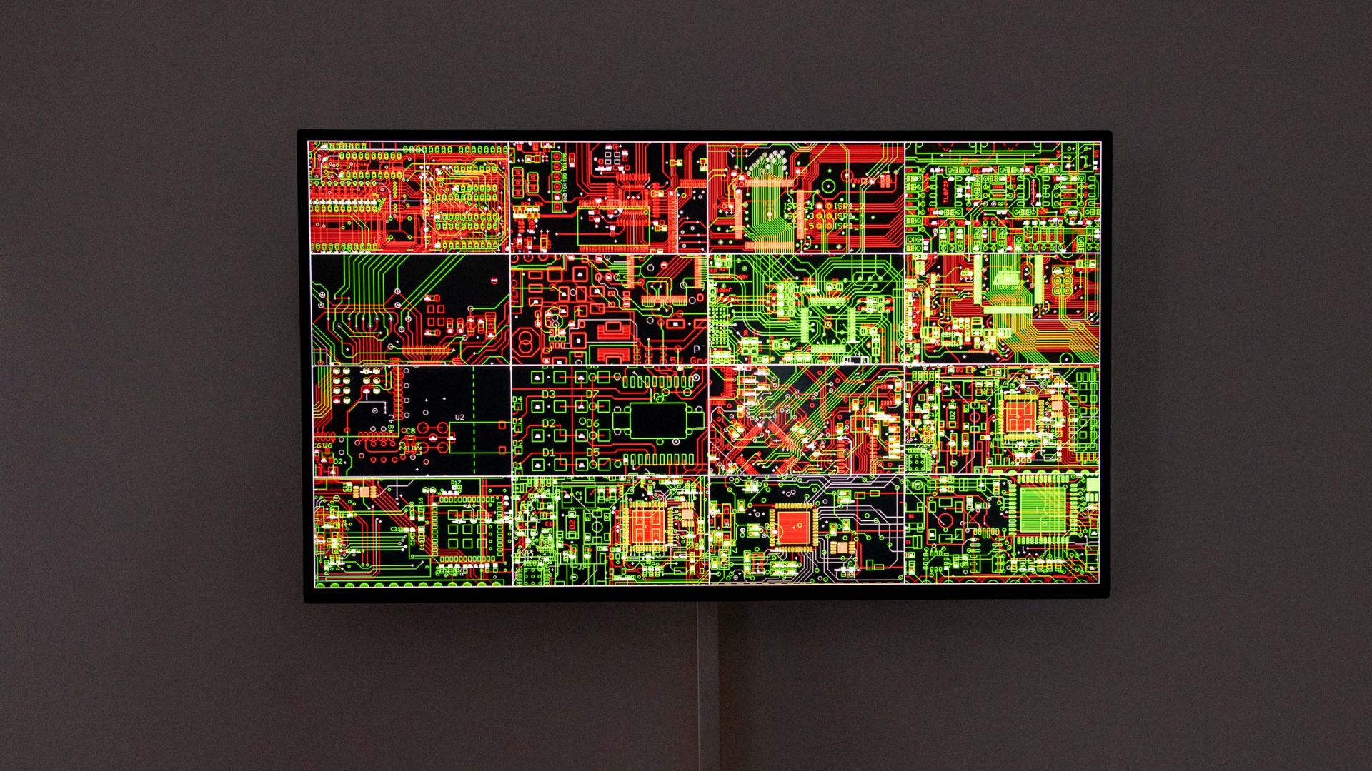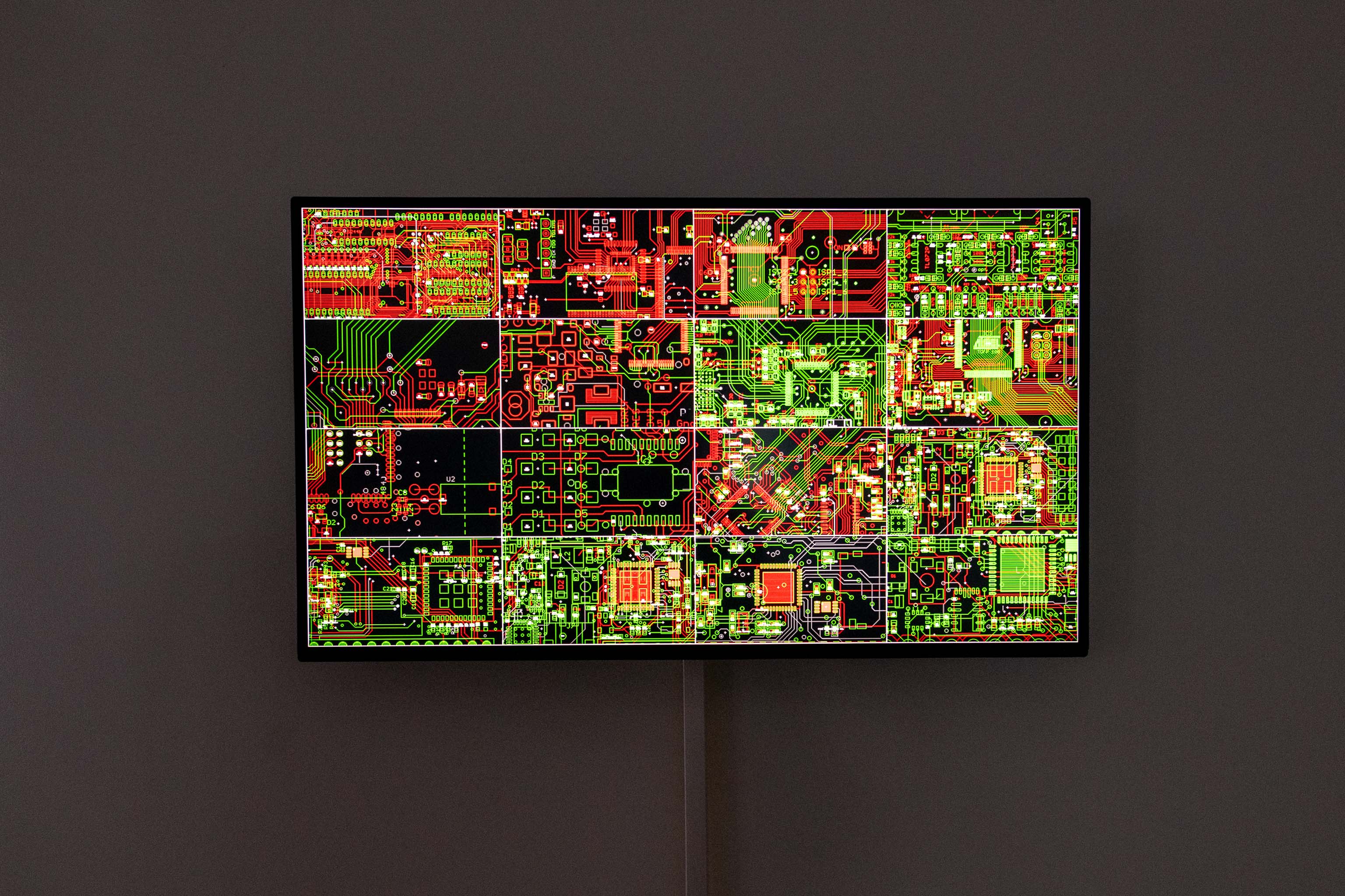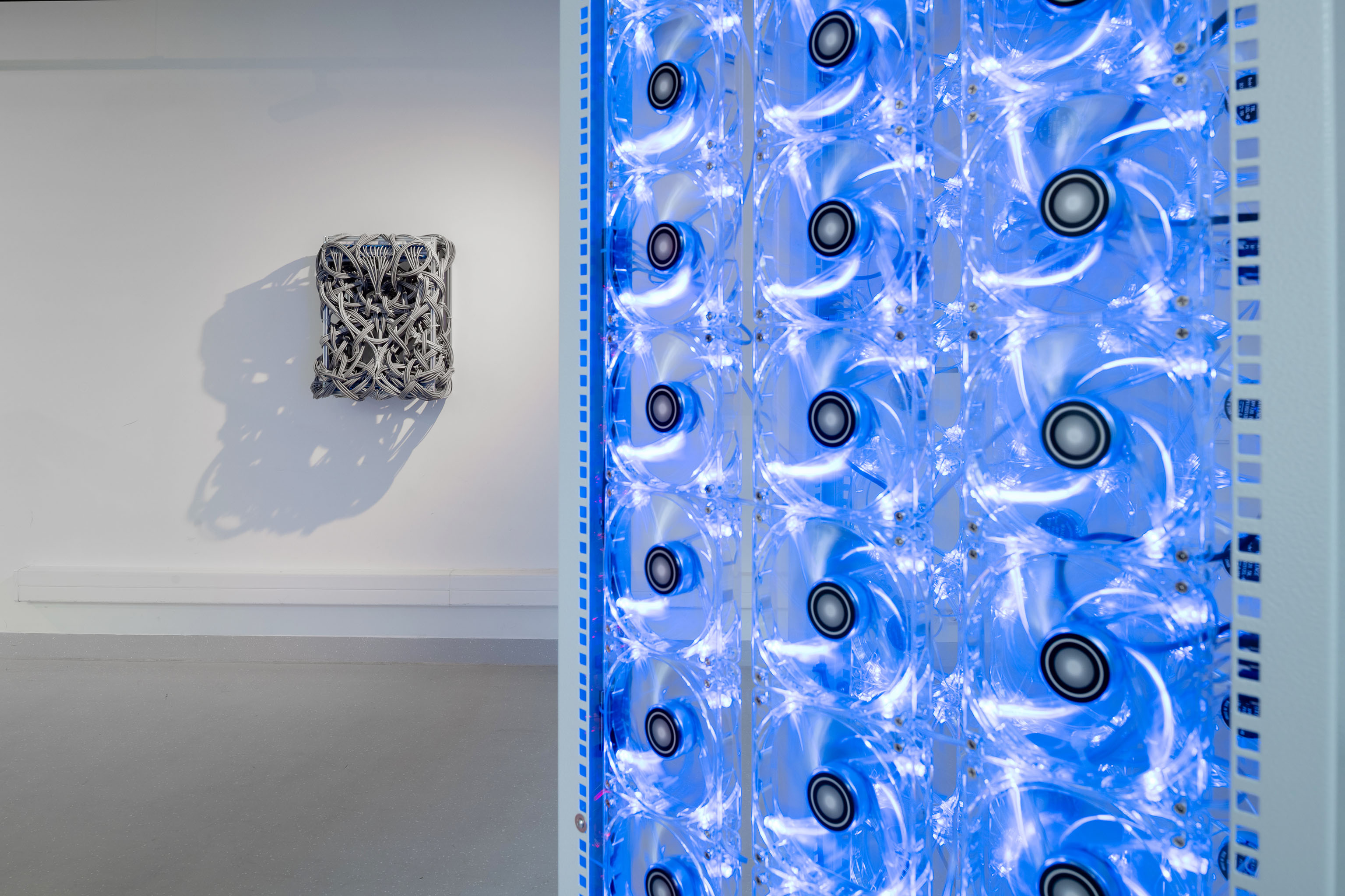 A hanghatással együtt egy szemgyilkos vörös fénynyaláb üti át a V-alakú képernyőket és égeti szét a retinát sistergő fényhatás kíséretében. Moszkitók vagyunk, mind, a szerverszobában, akiket felperzselt a nagy szingularitás, mint egy elektromos rovarcsapda. Vagy, egy másik, Hua Wang által fabrikált metafora szerint, műanyag teknősök, csigalassan lépkedő, tohonya őshüllők, a falból kilógó óriás márványkéz markában. Kapálózunk. Körülöttünk hálózati kábelekből szőtt relief, a gyorskötözővel rögzített szürke vezetékek kötegekben fonják be az alumínium szerkezetet. Váratlanul poétikus. Akárcsak a szerverházak hűtésére szánt, halkan surrogó miniventilátorok falként emelkedő sora. (Mindkettő Sarah Friend munkája.)
