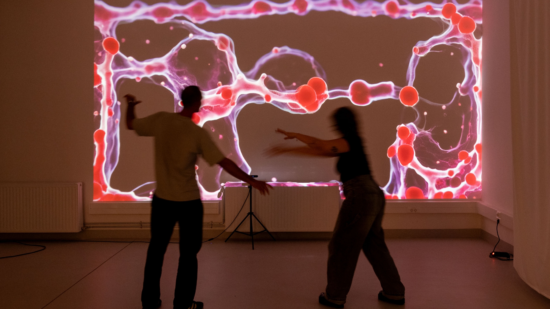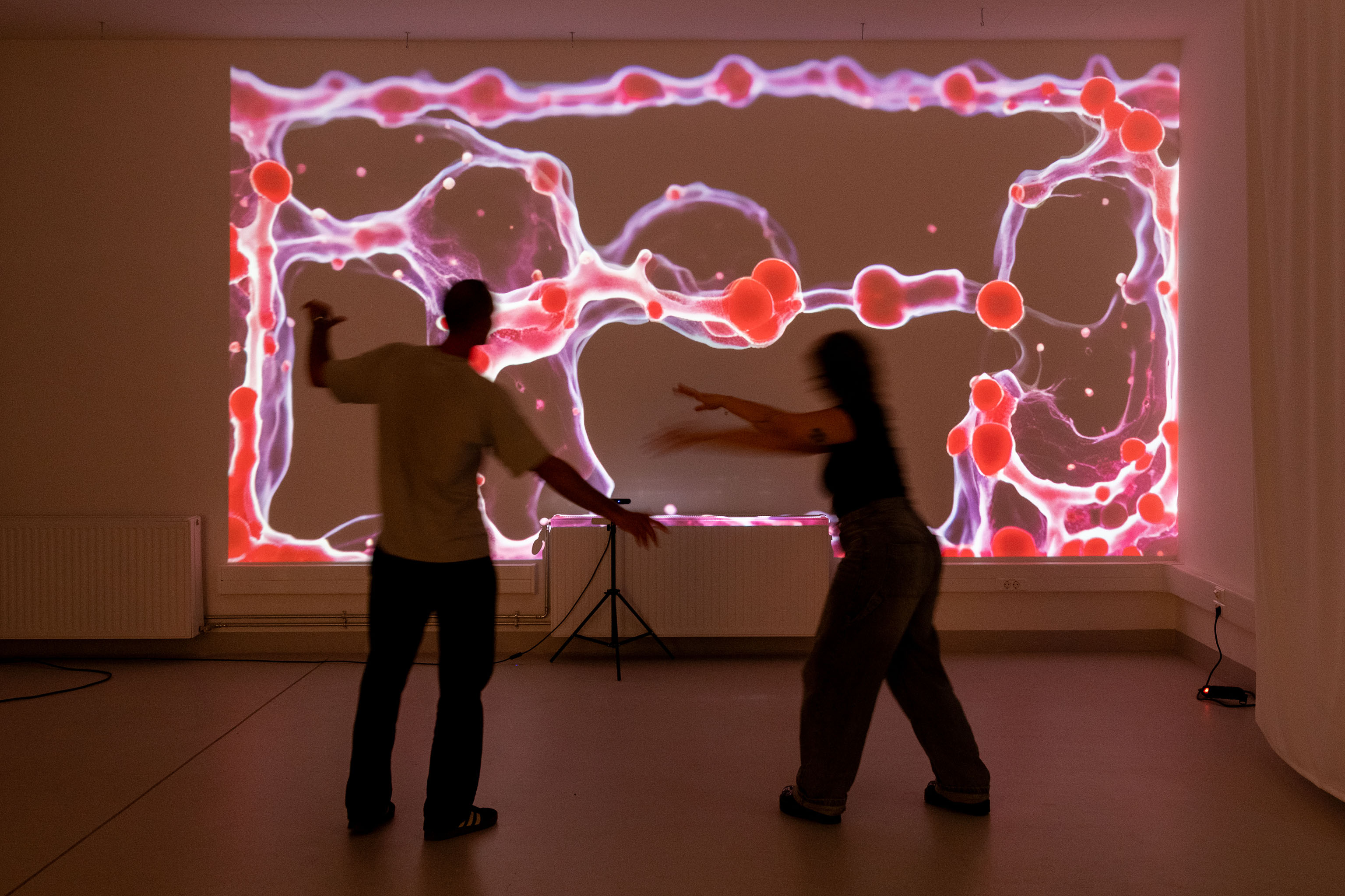 De van itt minden egyéb, ami a bináris síkról ingerelhet minket – a mi ősi, generális AI előtti teknős-világunkban. Fogdoshatjuk az Ejetch páros fantasztikus, búgó-zenélő okos textiljét, csinálhatunk virágcsendéletet folyékony pixelekből egy telefonos appon, kijátszhatunk két bizarr videójátékot, meghallgathatjuk a legendás techno-dj-k szettjeit, vagy akár a tech&art színtér leghíresebb szupersztárjának, Hito Steyerlnek egy előadását. 3D-printelt tárgyprotézisek, gamer-anarchizmus, alaplap-esztétika, arany páncélökölbe tartott búzakalászok. Azért ott felszalad a szemöldök, amikor a laboratóriumi patkányok neuronjai által generált fehér AI-pöttyszórást nézzük a fekete képernyőn. De a varázslat és a blöff itt kéz a kézben jár. Azt például, elsőre, elég lelombozónak gondoljuk olvasni, hogy AI-képeket lehet mozgással növeszteni-formálni egy kivetítőn. Jaj ne, sóhajtunk fel. Pedig Patrik Kiss és Mátyás Kálmán közös műve nagyon is működik. A szenzorokkal lekövetett néző sétálása amorf AI-ornamentikát szül a fehér falon. Lábunk nyomán pulzáló láva fröccsen, gombafonalak nőnek, vírustörzsek szabadulnak el, pókiszonyos csápok burjánzanak. Beállunk a fehér térbe, és karmesterként irányítjuk az AI fantáziáját. Embernek érezzük magunkat, nagy E-vel, a teremtés koronájának, a gépek mesterének, a nagy kódírónak.