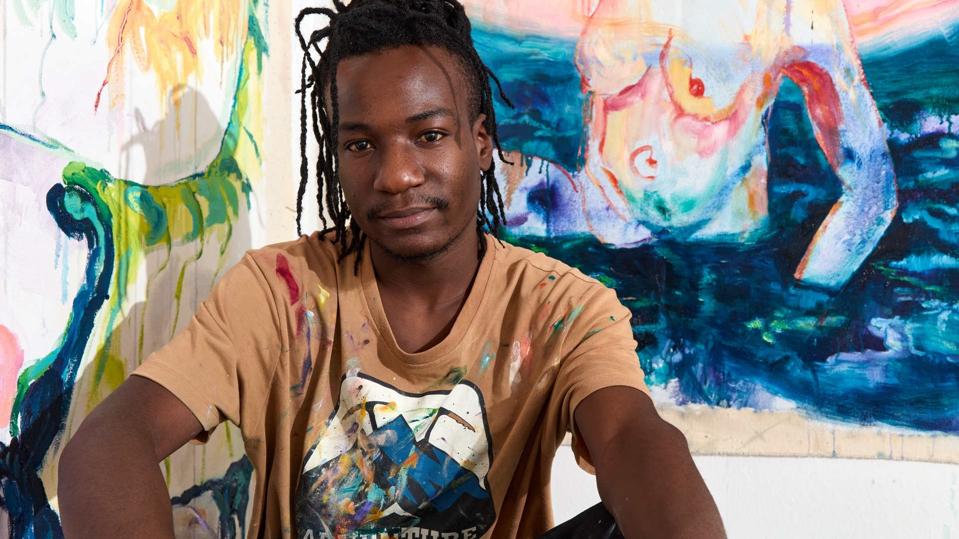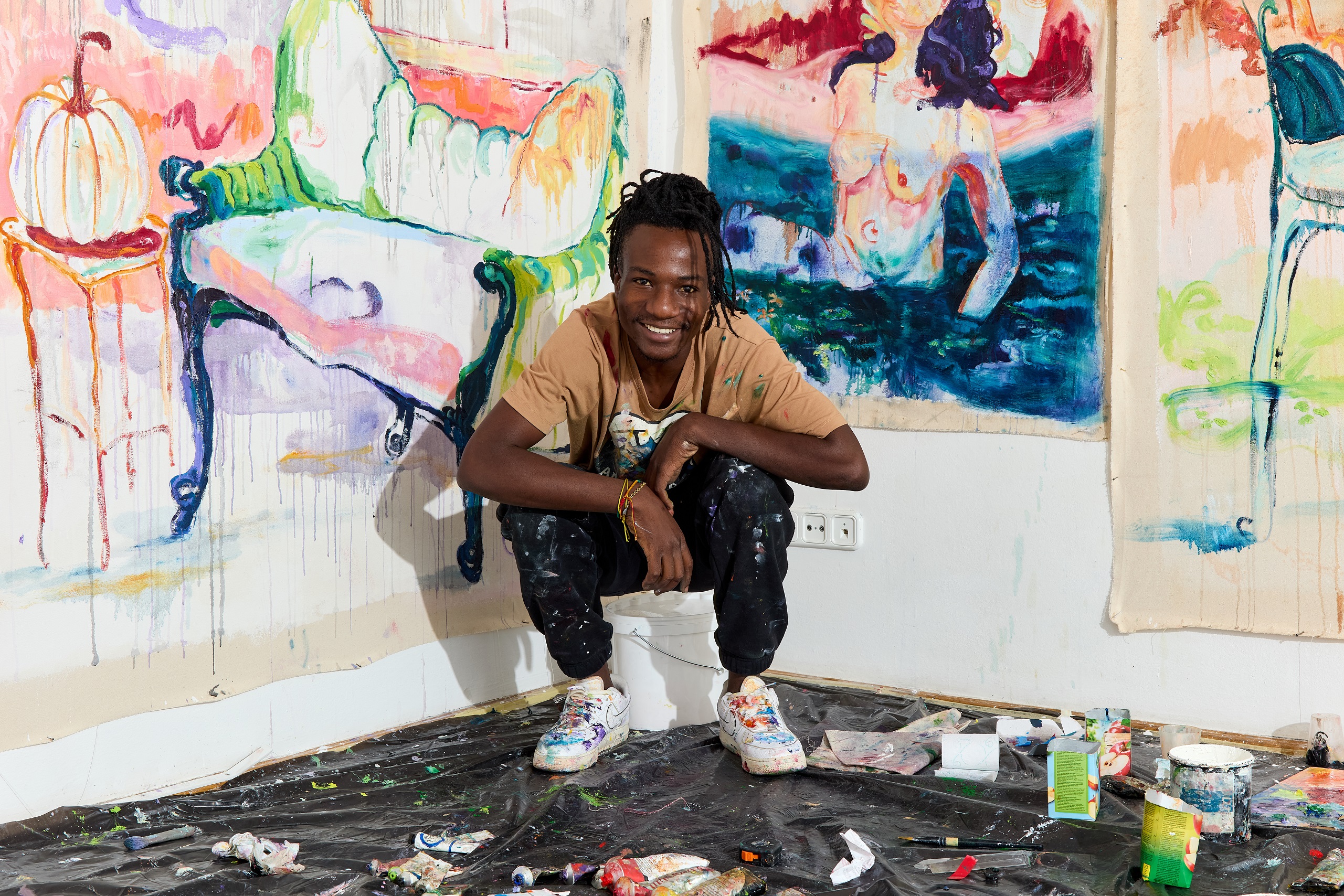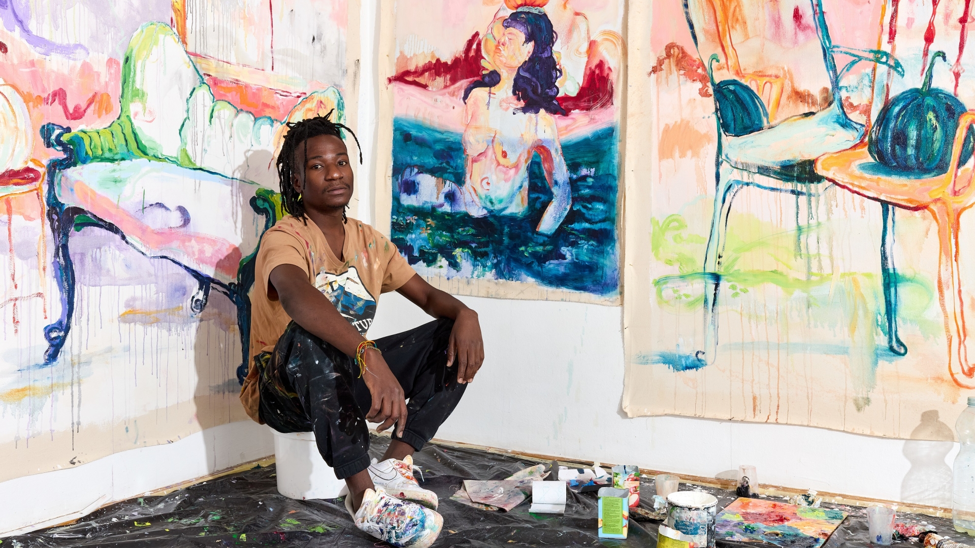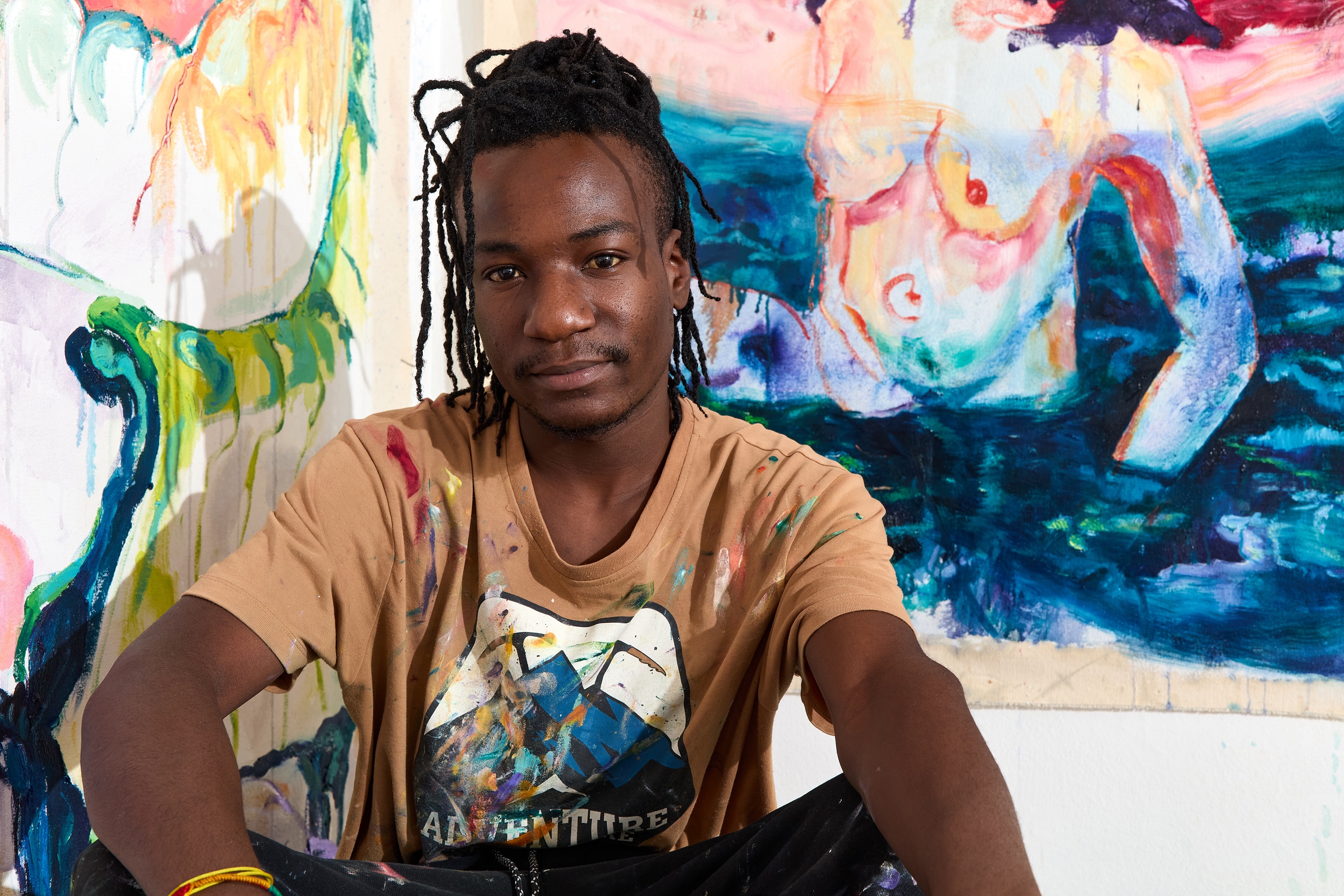 A gyökerek és az identitás kérdése hangsúlyos a művészetében, ez már 2023-ban látható volt az első önálló kiállításán Zimbabwéban, amely az Incipience of Responsibility címet viselte. Meg is kapta még abban az évben a legjobb feltörekvő művésznek járó díjat, márpedig az ottani képzőművészeti szcéna elég erős ahhoz, hogy ez komoly elismerést jelentsen. 2024-ben következett egy újabb önálló kiállítás Drowning in my Senses címmel. Művei közben eljutottak Franciaországba, Londonba. A Fondation Blachère bonnieux-i kiállításán az ő festménye került rá a rendezvény reklámplakátjára. Megtehetné, hogy elszáll magától, ő azonban fest nyugodtan tovább, saját belső indíttatását követve. Elmondása szerint alapjáraton otthonülő típus, egész napokat elvan a stúdióban a festményeivel. A „bent” fogalma azonban megint érdekes kérdéseket vet fel, hiszen a festményein gyakran organikusan összekeveredik a természeti környezet és a meghitt, belső tér, összefolyik a kint és a bent. Mintha egy álomban próbálná az elménk összerakni az otthon darabkáit. A néző tekintetének gyakran egy szék jelenti a fogódzót ezeken a képeken, erről is próbálom faggatni Again-t. Kissé szégyenlősen vallja be, hogy egyik felmenőjük fejedelem volt, és fából faragott széke generációról generációra öröklődik a családban, így számára ez a meglehetősen hétköznapi tárgy az ősökkel való kapcsolódást szimbolizálja. Az énkeresés gyakran a replika, a tükröződés motívumában érhető nála tetten. Ez megfigyelhető A version of my better self című 2024-es képén, és jelenleg a stúdióban is látunk ezzel a technikával készült munkát. A fauve-os, merész színek mellett sem lehet csak úgy elmenni, a képek szuggesztivitása részben ebből is adódik, valamint Again saját módszeréből, ahogy a festéket kikeveri. Megmutatja a szinte már buborékos részeket a festményen, ahol kicsit több lenolajat adott a festékhez, és ezzel légiességet, fluiditást kölcsönzött a témának. ![]()