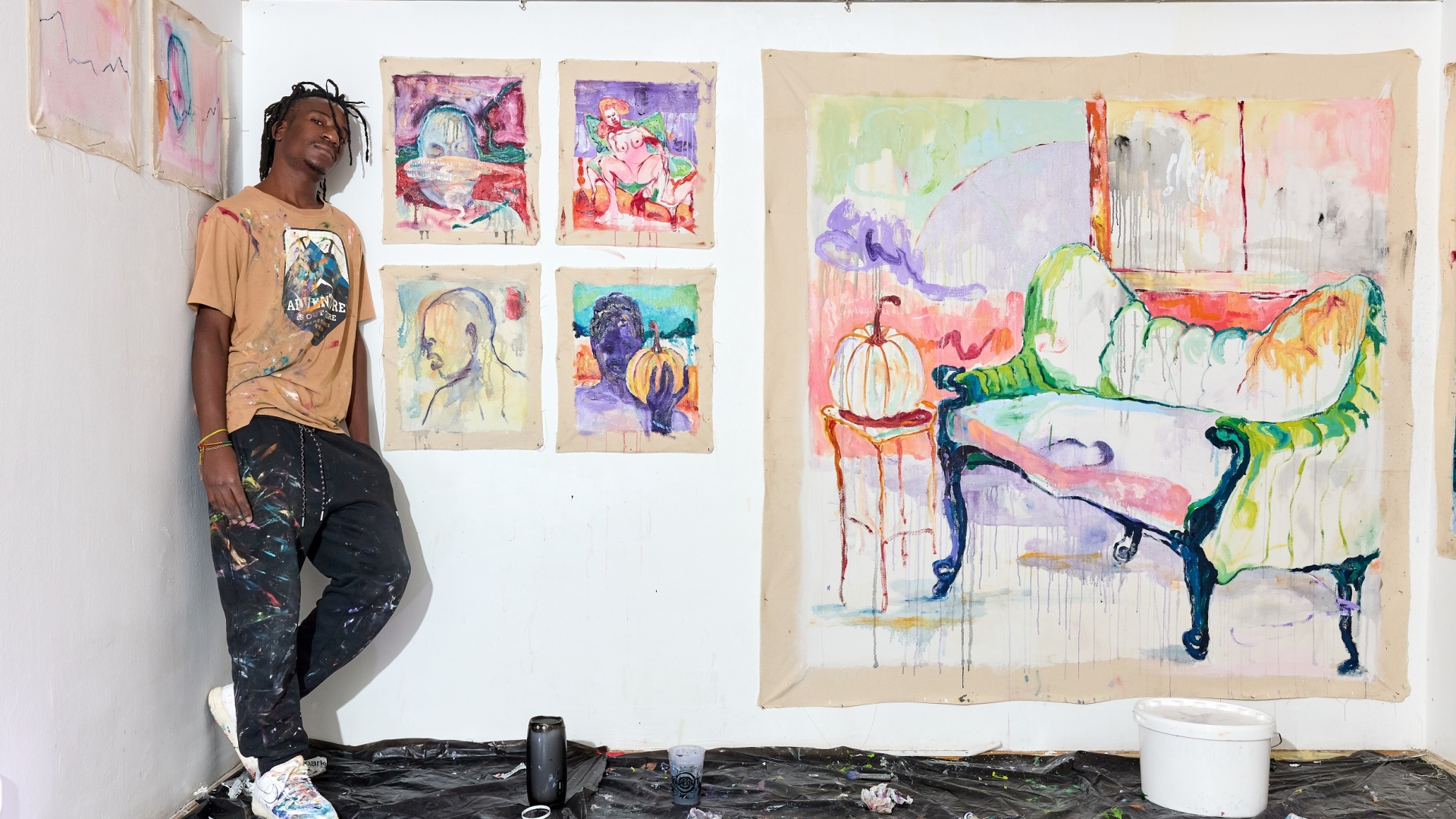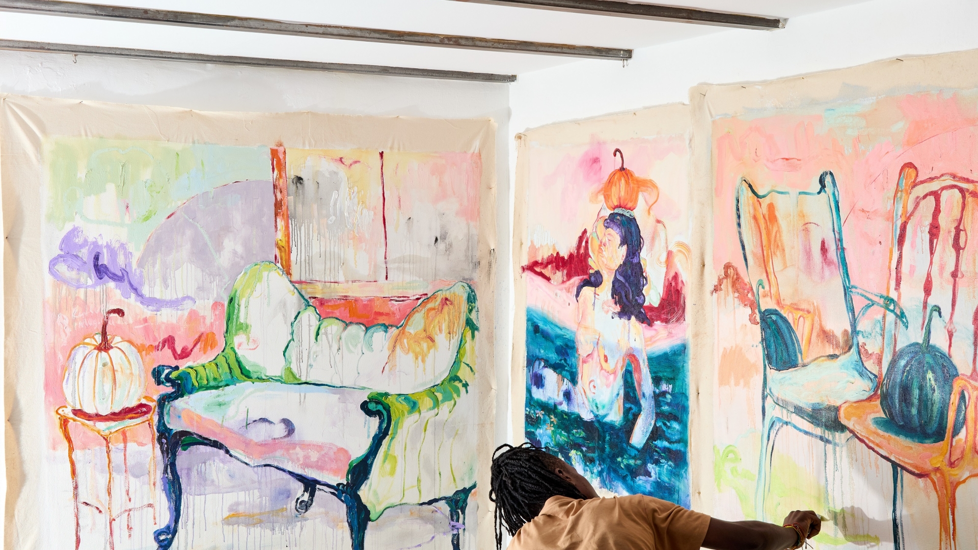 Nos, bevallom, nem tudtam. Én azt hittem, a közelgő Halloween-ra akar utalni vele. „Nem tudtam egyáltalán semmit a Halloween-ról, még csodálkoztam is, miért árulják mindenfelé nálatok azt a rengeteg tököt — nevet jóízűen. Ennyit az interkulturális bonyodalmakról. AZ ÖSSZES KÉP: Részletek a műteremből, Living Gallery, Budapest, 2025.