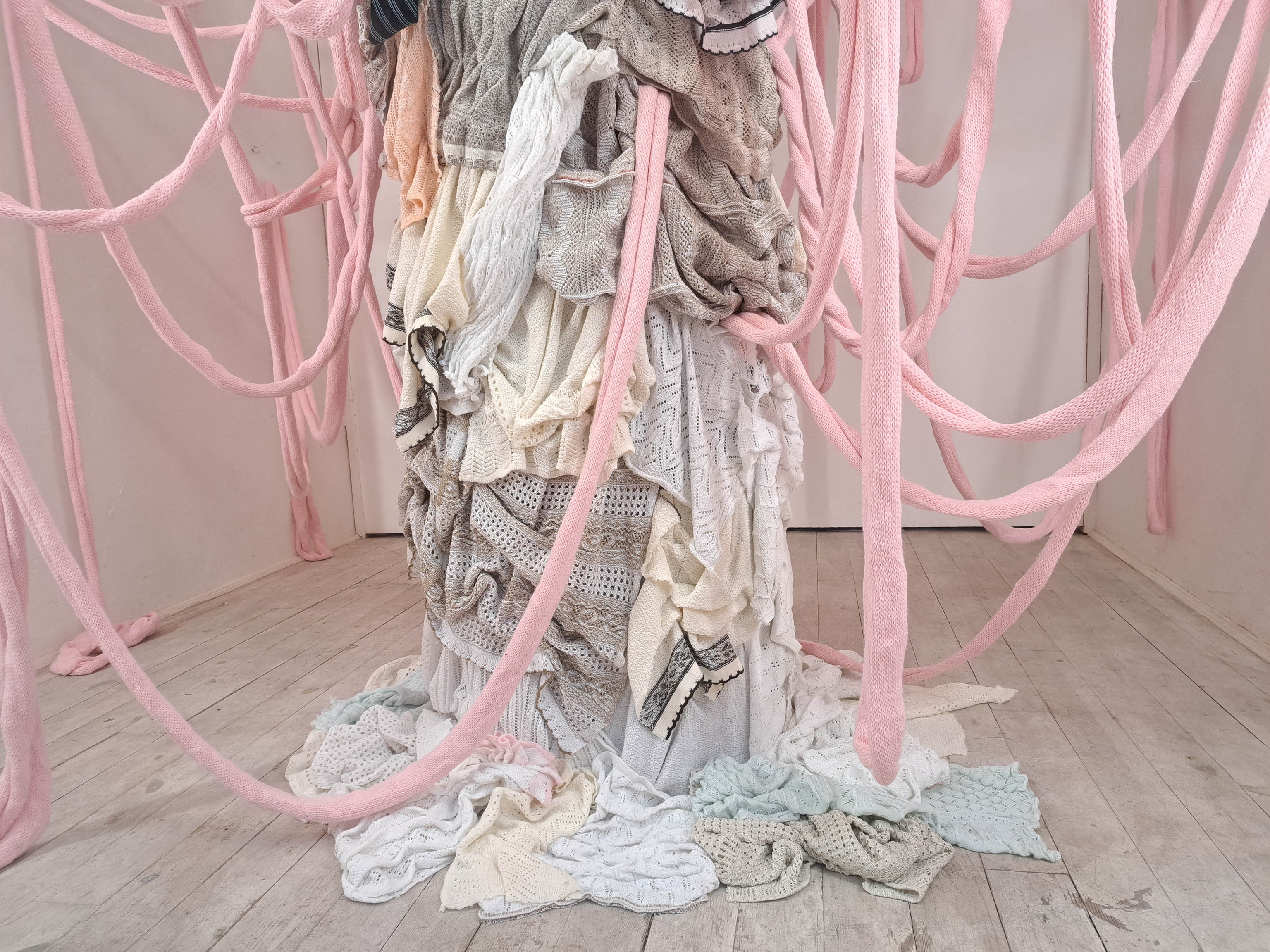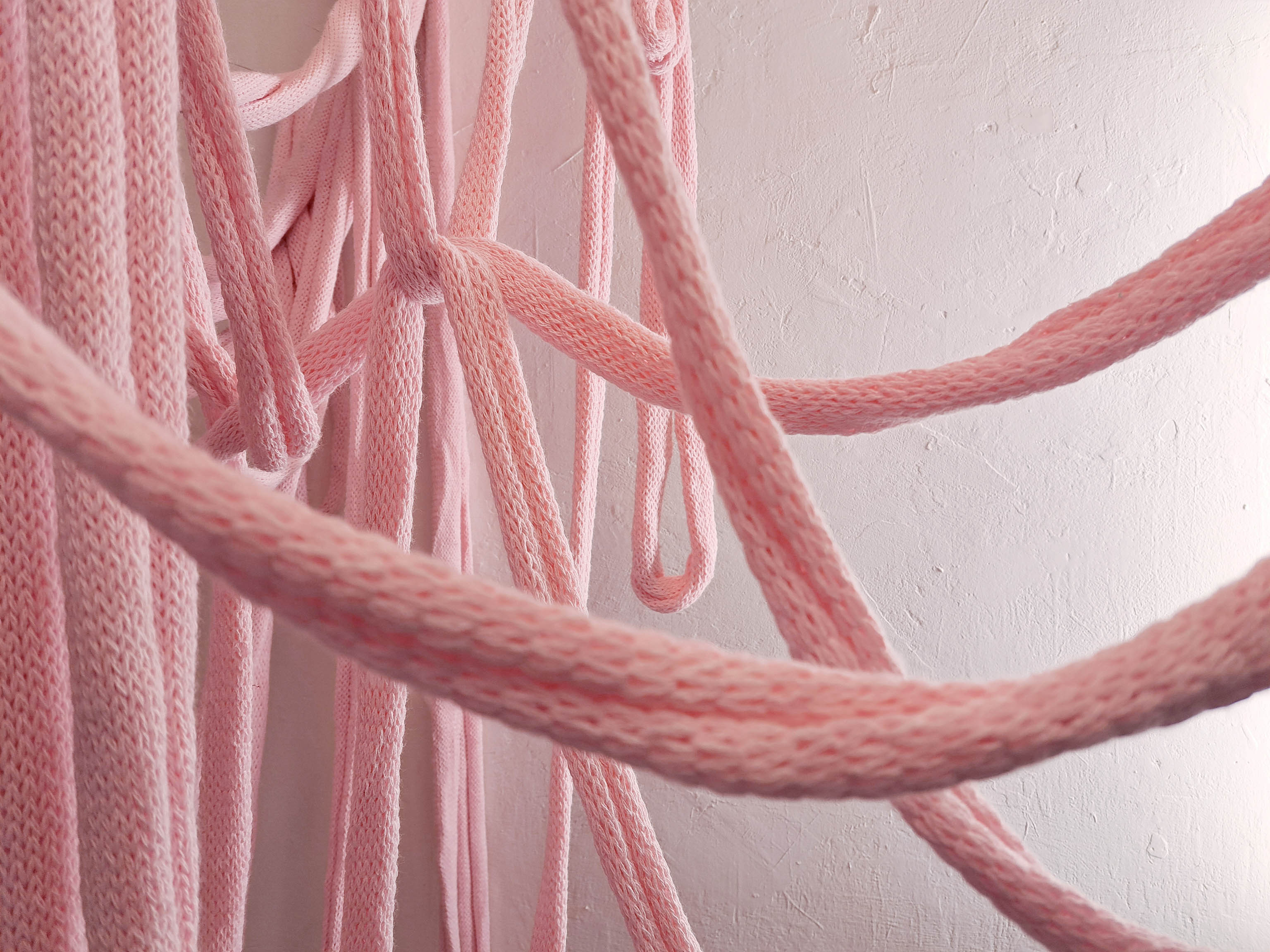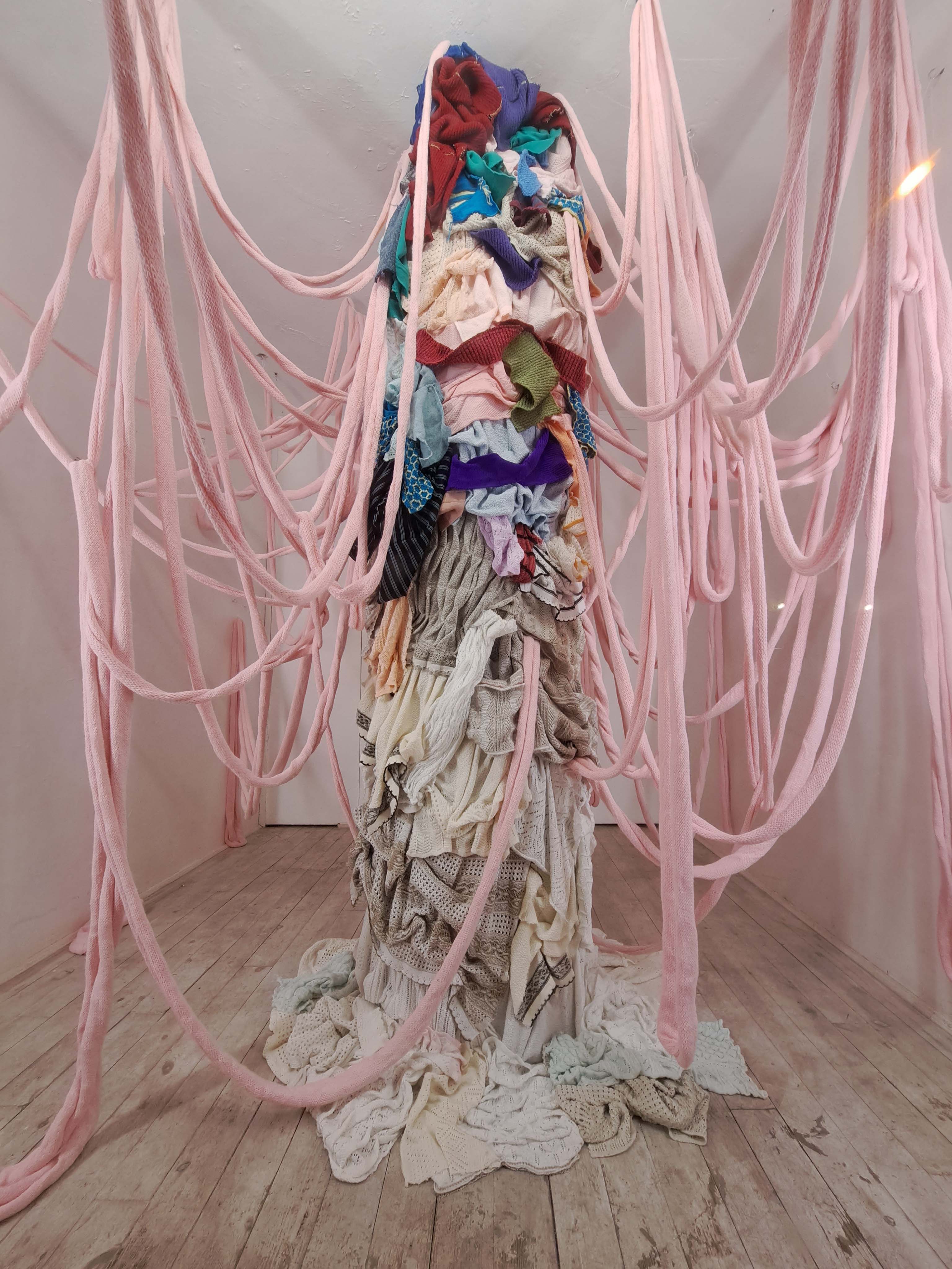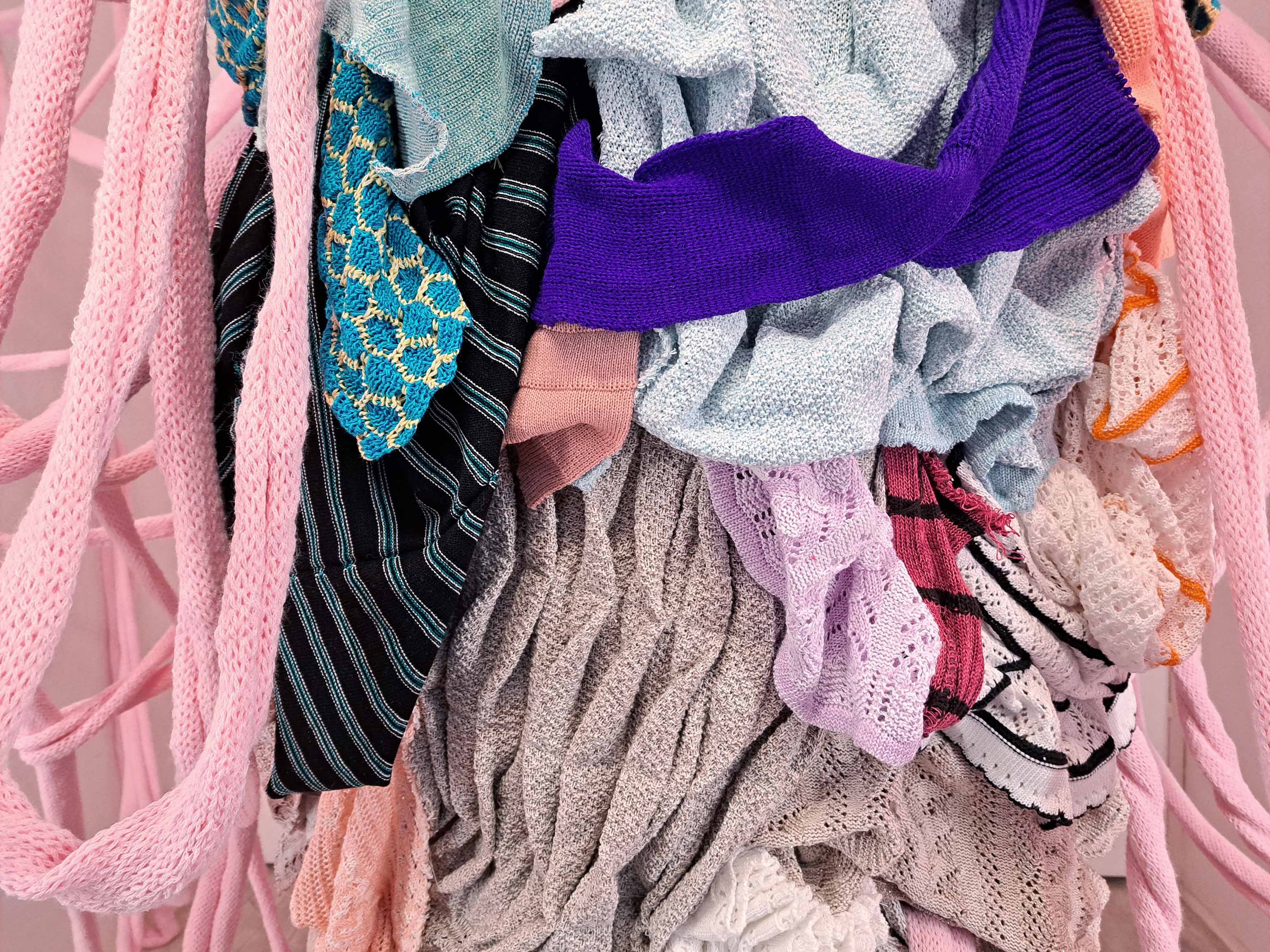 Szabó Zsuzsanna régóta foglalkozik fő médiuma, a kötés, különböző kontextusokban való mélyebb elemzésével. A Puccsban bemutatott installációját a kötött tárgyak készítése során, a műhelyekben elkerülhetetlenül felhalmozódó nagy mennyiségű kísérleti kötés inspirálta. A belőlük készülő, egész teret betöltő szobor-installációt szemlélve elgondolkozhatunk az egyébként is vizuálisan túlstimulált világunkról, a textilipar környezetet terhelő túltermeléséről, a káoszról, és a benne rejlő szépségről.