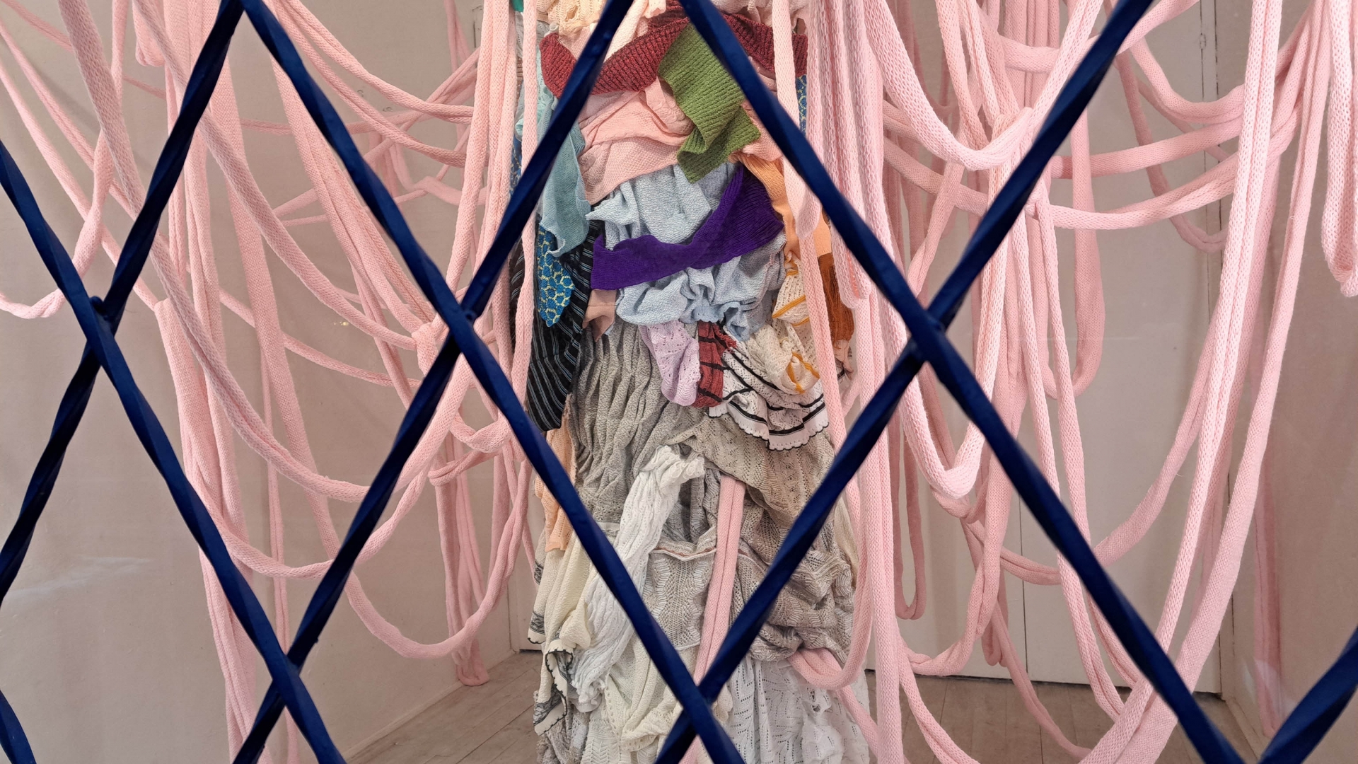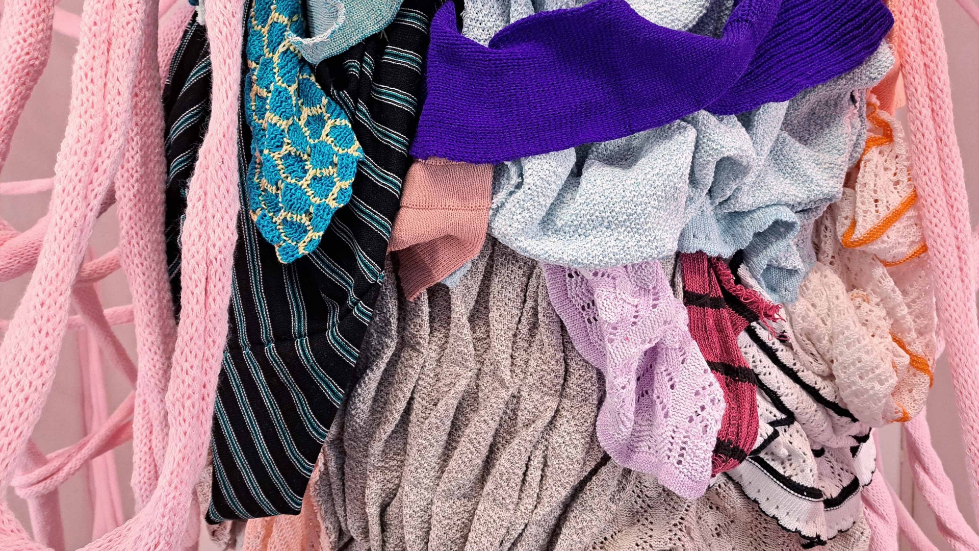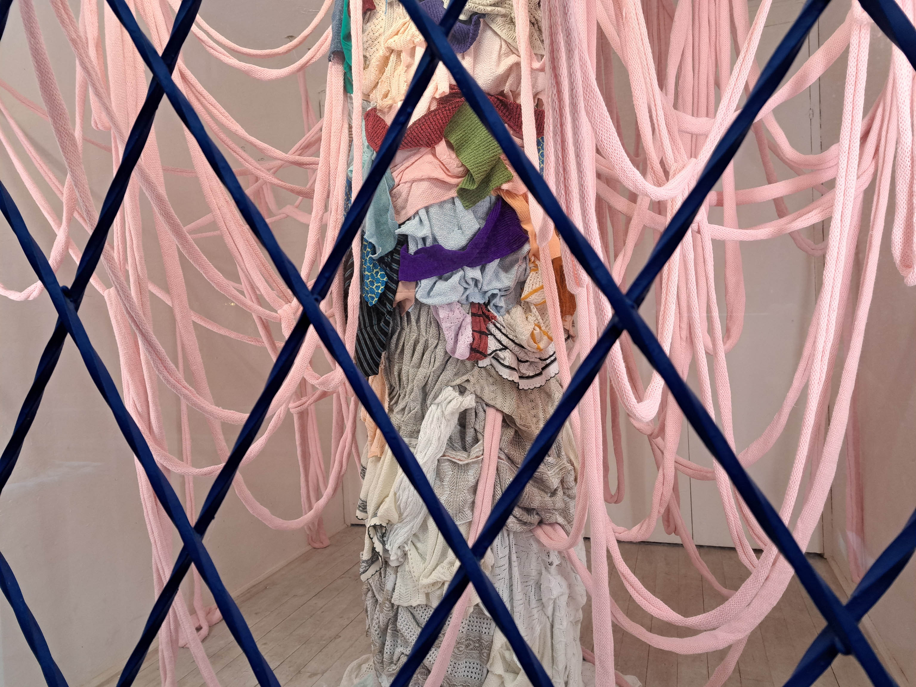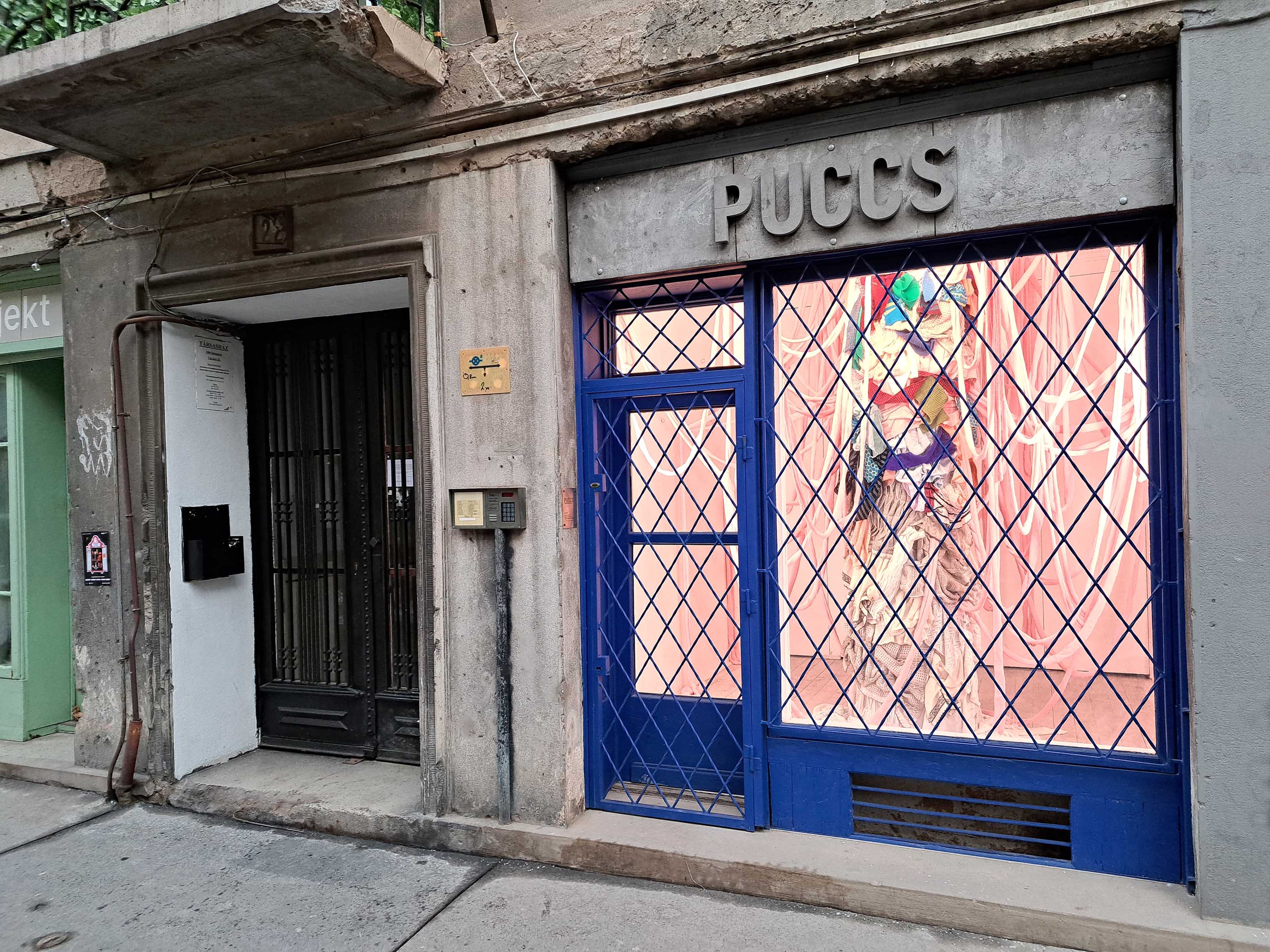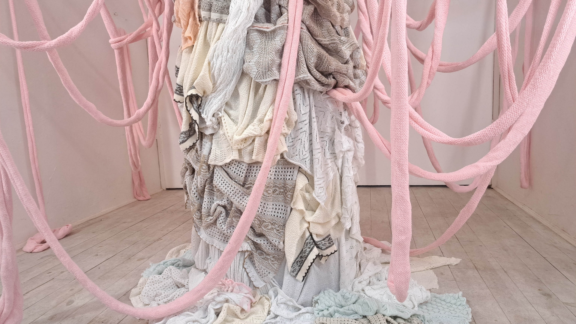 Szabó Zsuzsanna régóta foglalkozik fő médiuma, a kötés, különböző kontextusokban való mélyebb elemzésével. A Puccsban bemutatott installációját a kötött tárgyak készítése során, a műhelyekben elkerülhetetlenül felhalmozódó nagy mennyiségű kísérleti kötés inspirálta. A belőlük készülő, egész teret betöltő szobor-installációt szemlélve elgondolkozhatunk az egyébként is vizuálisan túlstimulált világunkról, a textilipar környezetet terhelő túltermeléséről, a káoszról, és a benne rejlő szépségről.