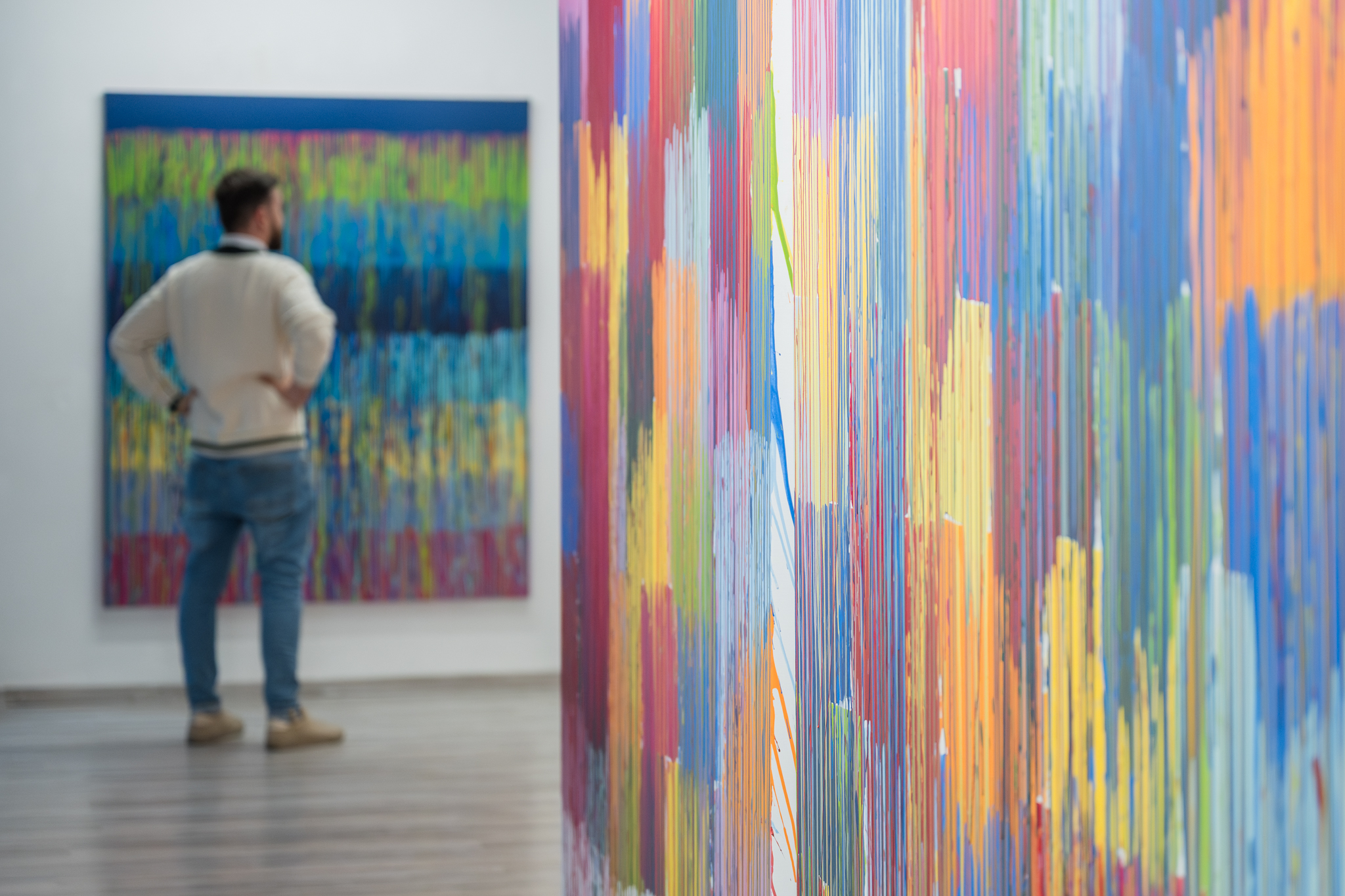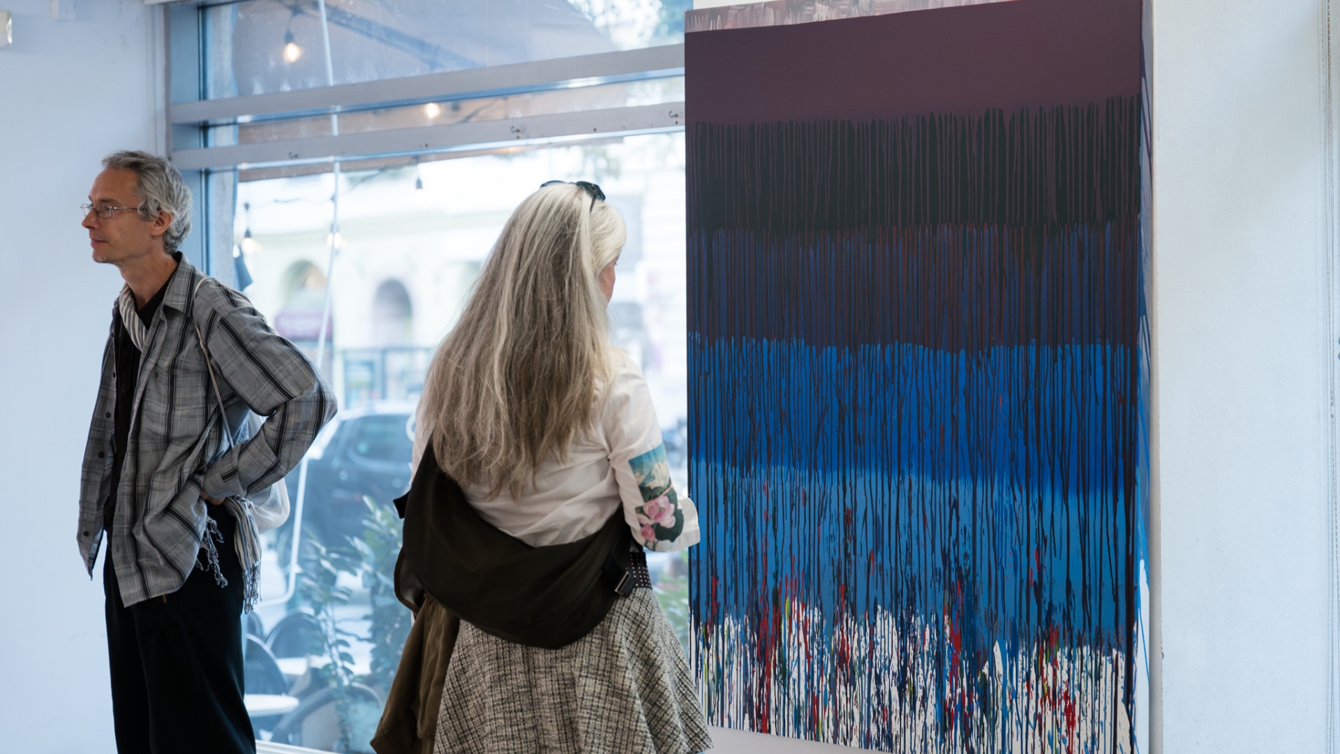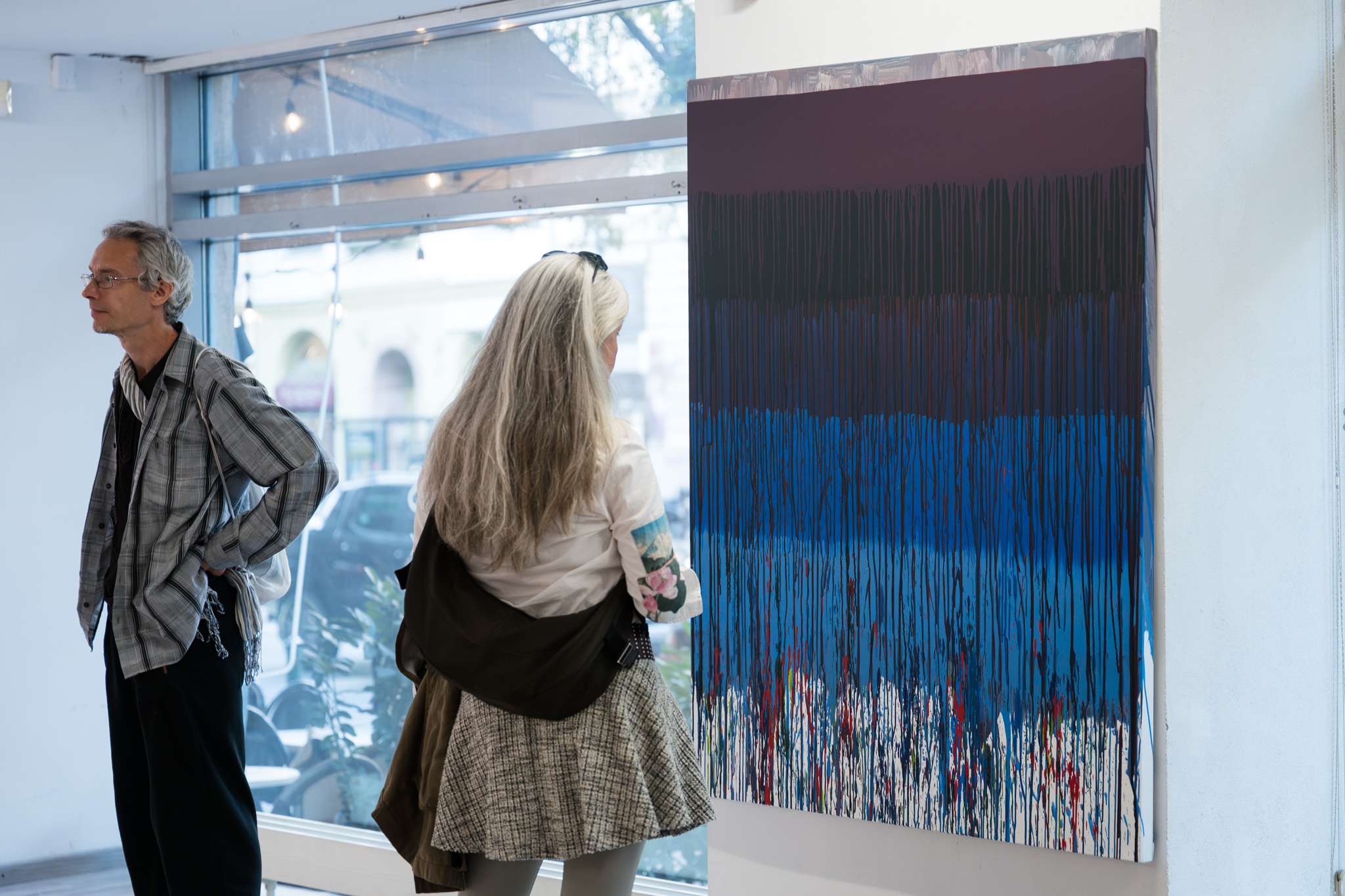 Ezek a festmények tehát nem egy konkrét táj, hanem egy állapot topográfiái. A színek sávjai, a lecsorgások ritmusa mintha az ablakon túli világ torzított tükörképei lennének. A néző, miközben a festmények előtt áll, ugyanazt a mozdulatot végzi, mint a festő: követi a lecsorgó festéket, olvassa a vertikális irányt, és ezzel együtt belehelyezkedik a kép idejébe. A szem és a test mozdulata itt összeér, a befogadás fizikai tapasztalattá válik. E mélyebb tónusú vásznak a befelé figyelés tereit hozzák létre.