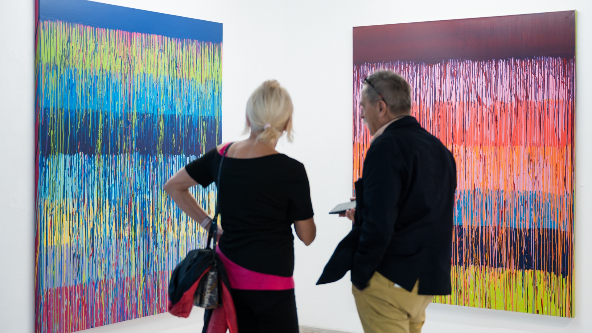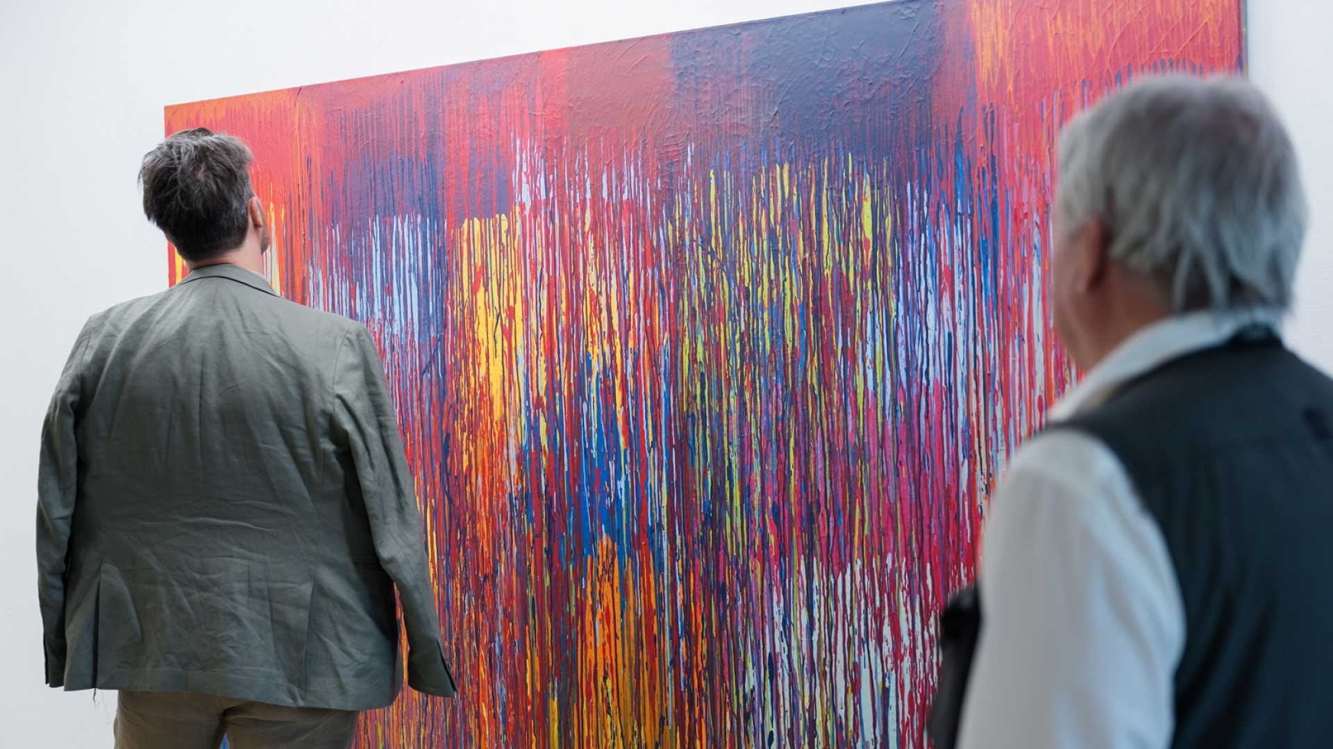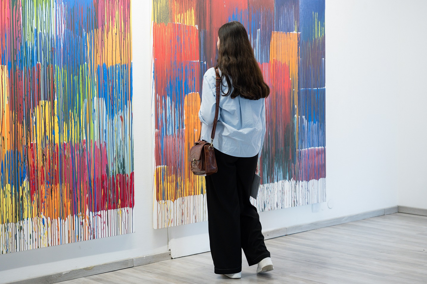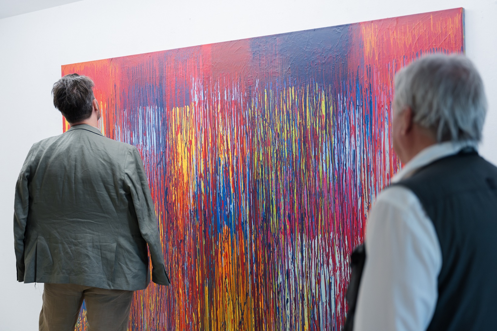Ezek a festmények tehát nem egy konkrét táj, hanem egy állapot topográfiái. A színek sávjai, a lecsorgások ritmusa mintha az ablakon túli világ torzított tükörképei lennének. A néző, miközben a festmények előtt áll, ugyanazt a mozdulatot végzi, mint a festő: követi a lecsorgó festéket, olvassa a vertikális irányt, és ezzel együtt belehelyezkedik a kép idejébe. A szem és a test mozdulata itt összeér, a befogadás fizikai tapasztalattá válik. E mélyebb tónusú vásznak a befelé figyelés tereit hozzák létre.
