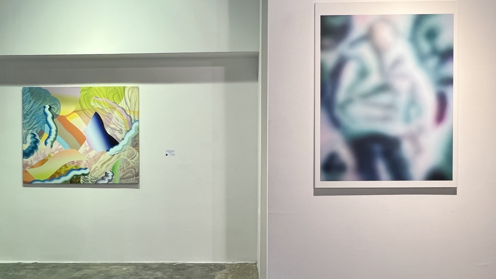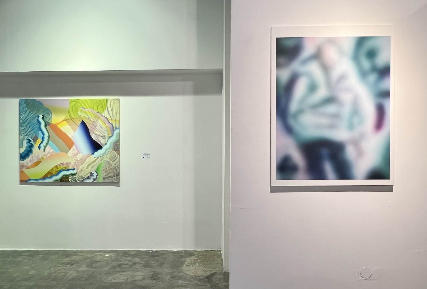 A Kontempláció plasztikájával szemben láthatjuk Szakál Éva és Vető Orsolya Lia munkáját. Szakál akrillal vászonra festett #00F12 (2022) meditatív kompozíciója organikus formákat vonultat fel, pontosabban, hagyja, hogy azok ide-oda áramoljanak. A címbeli hashtag (kettő kereszt) a digitális kultúrára utal, a kép pedig az érzékelésünkkel, a színekkel játszik. Vető Orsolya Liquid Slices of Time (Risky) (2023) című munkája koloritban tobzódik:elsősorban a kék árnyalatai dominálnak, de lila, rózsaszín, sárga és fehér, liquid formái is élettel teliek.
