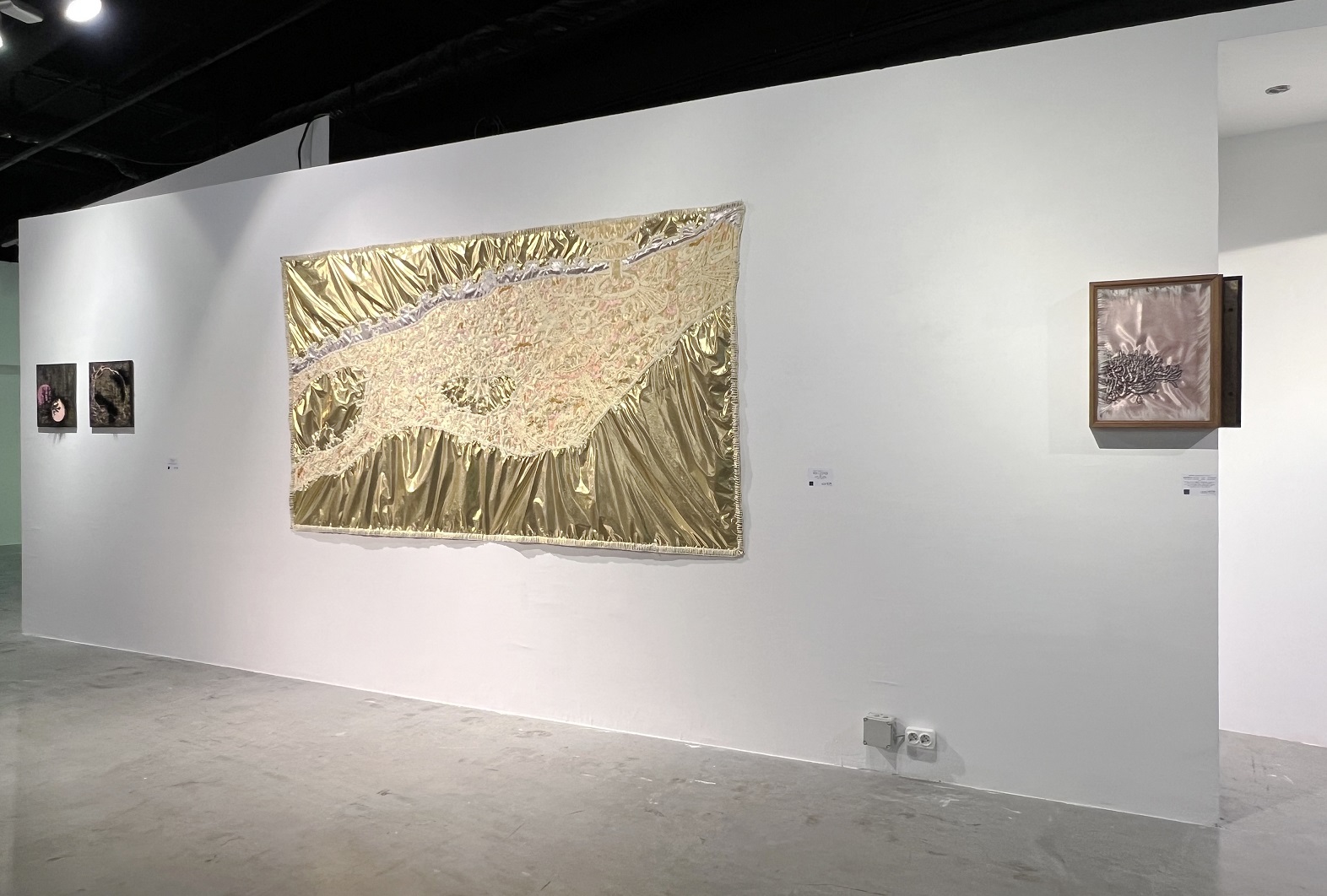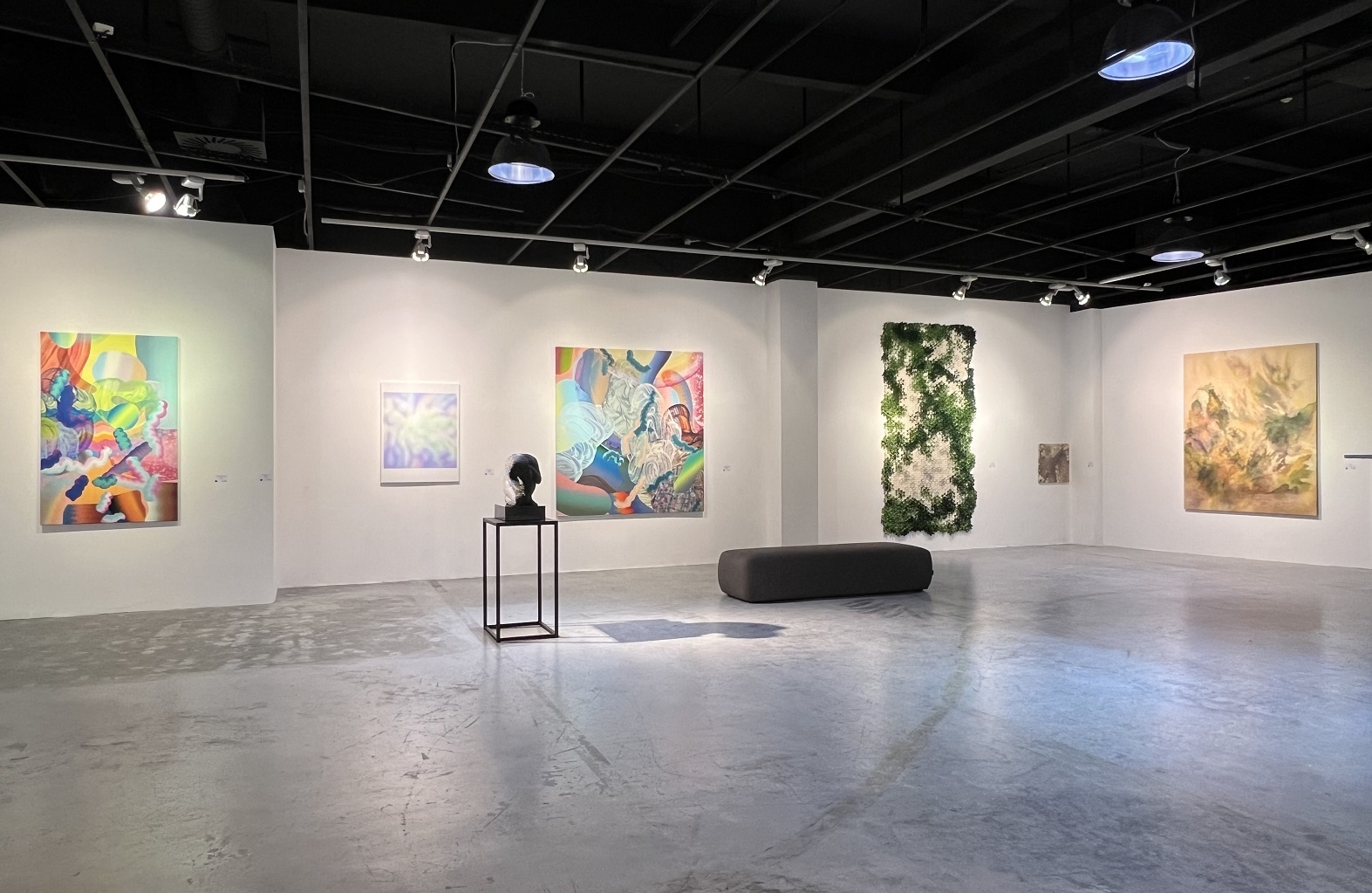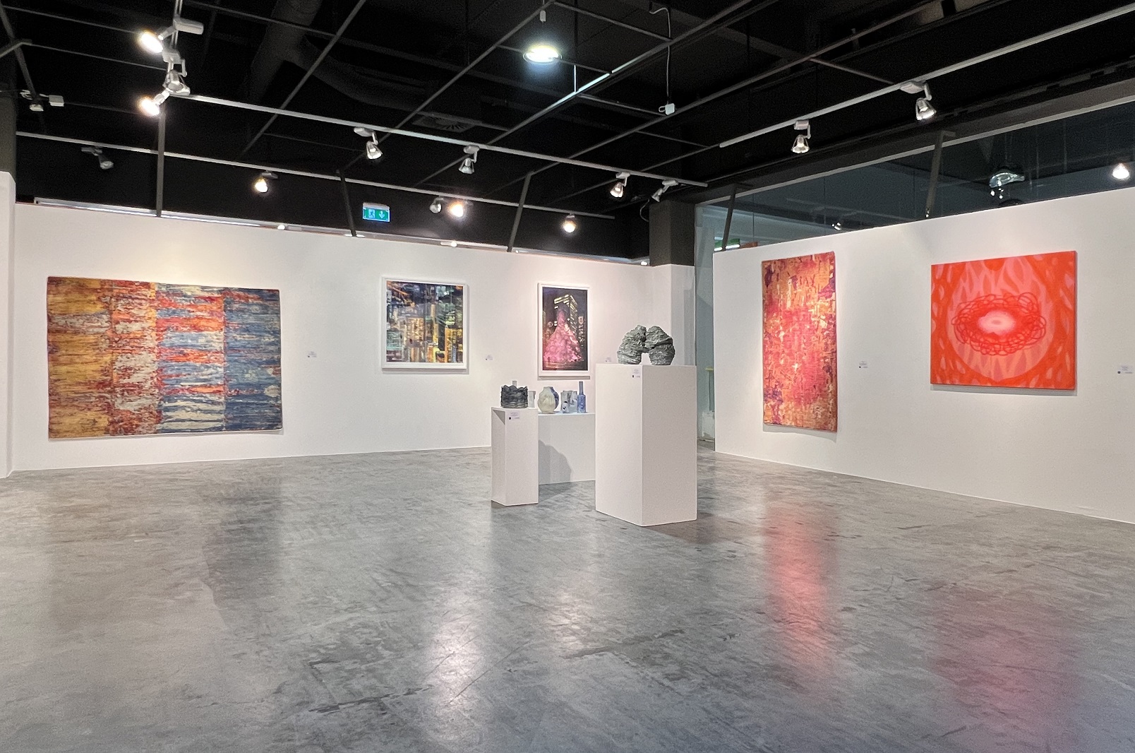 Nem pusztán a műalkotások színvilága miatt izgalmas a tárlat, hanem az anyagok és témák sokszínűsége miatt is. A változatosság már a térbe történő belépéskor érzékelhető. A bejárattól cirka tíz lépésre áll Majoros Áron Zsolt 2022-es Kontempláció című bronz kisplasztikája. A mű egy összekuporodott női alak. Egyik keze a térdén, a másik a fején. Testhelyzete gondterheltségről, de meditatív állapotról is vallhat. A figura csendre vágyva temetkezik bele önmagába. Menekülés ez a külvilágtól, befeléfordulás lényünk mélyebb megismeréséhez?