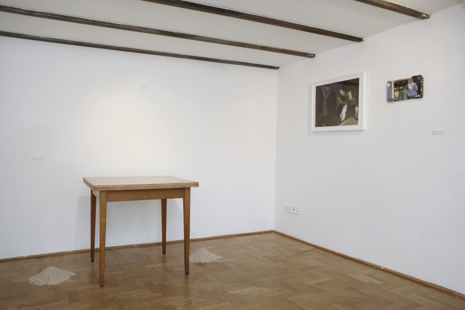 Részlet a PostContemporary című kiállításból (balra: Stano Masár: Post Dialogue; jobbra: Kupcsik Adrián: Cut Out, 2014 és Kupcsik Adrián: Tízezres, 2015), 2015, Chimera-Project
