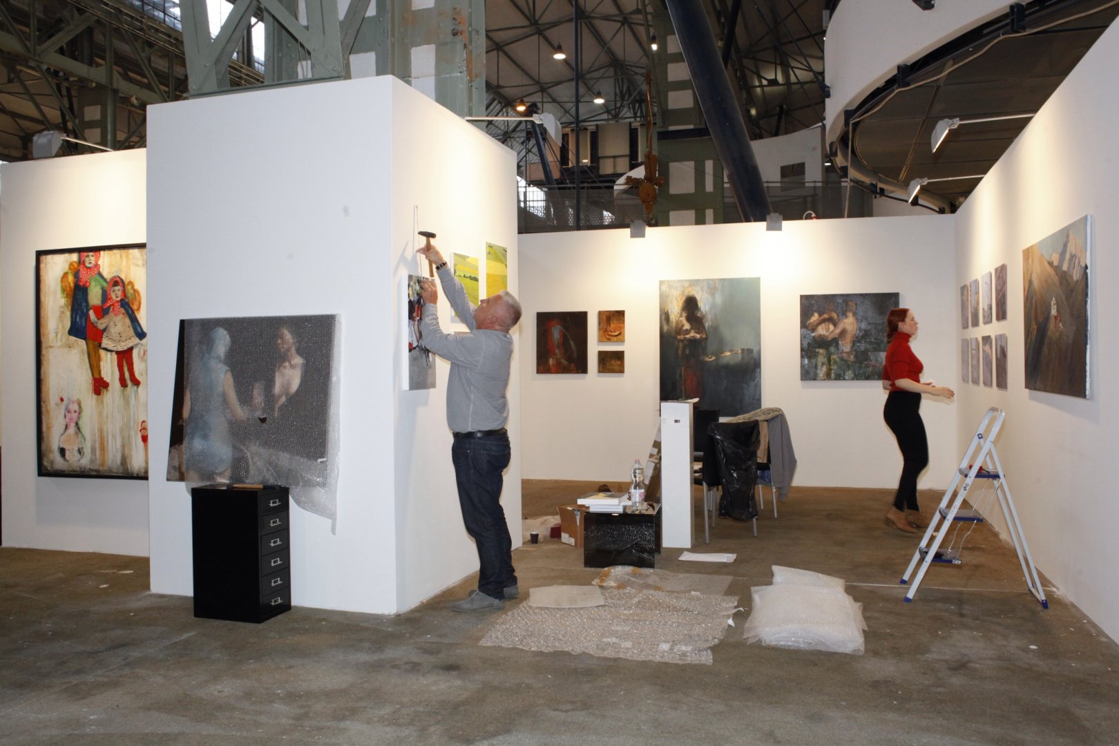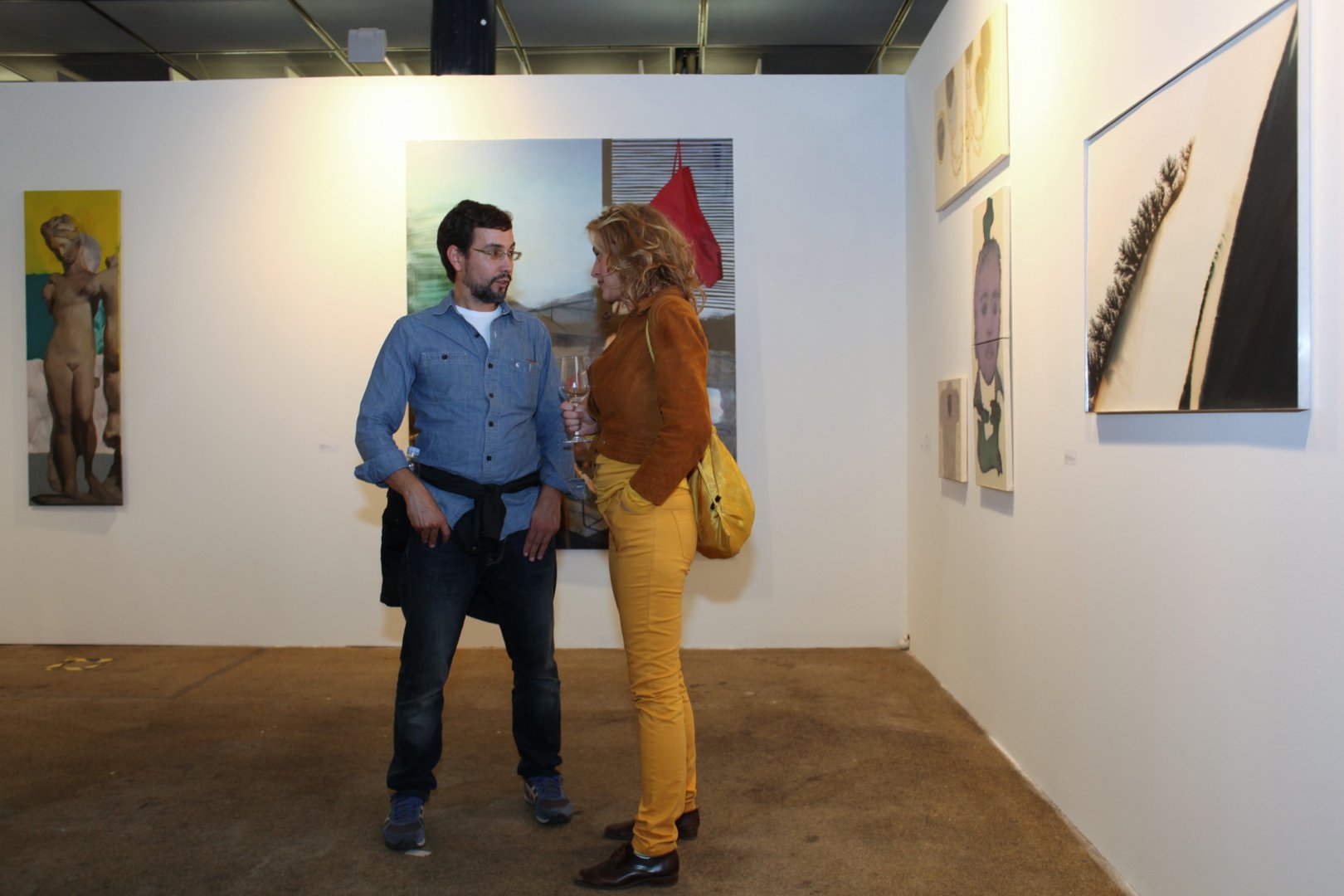 A Viltin Galéria festményekkel teli standján két nem viltines művész beszélget, Barakonyi Zsombor és Babinszky Csilla.