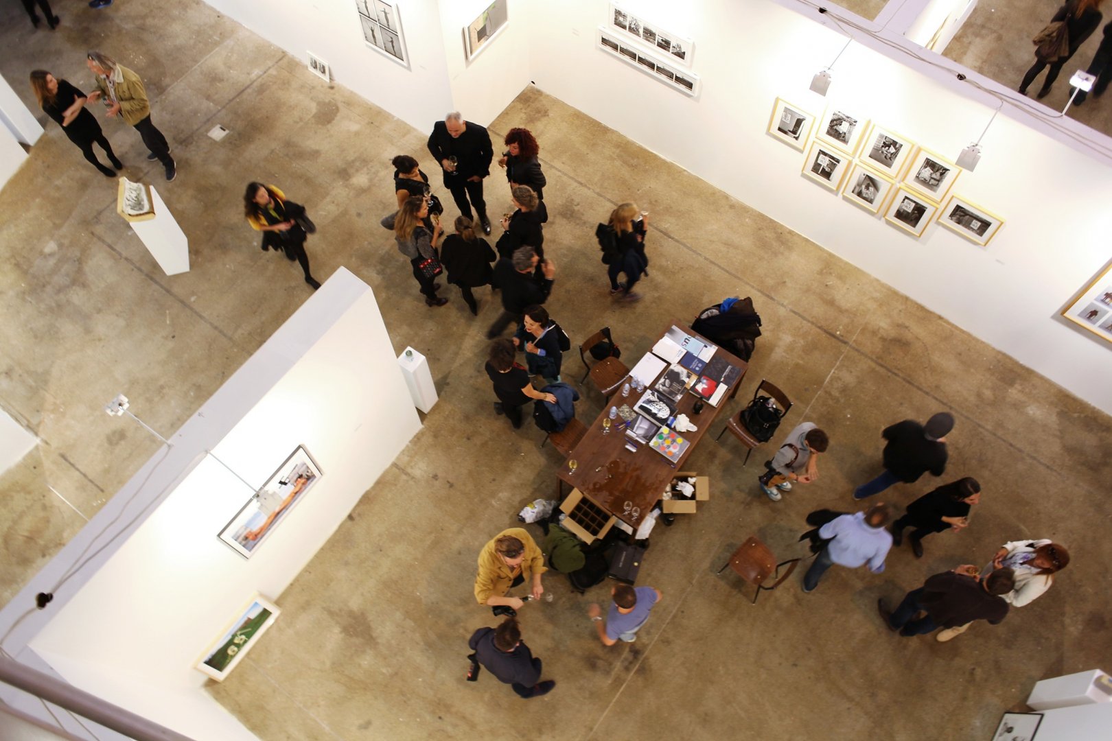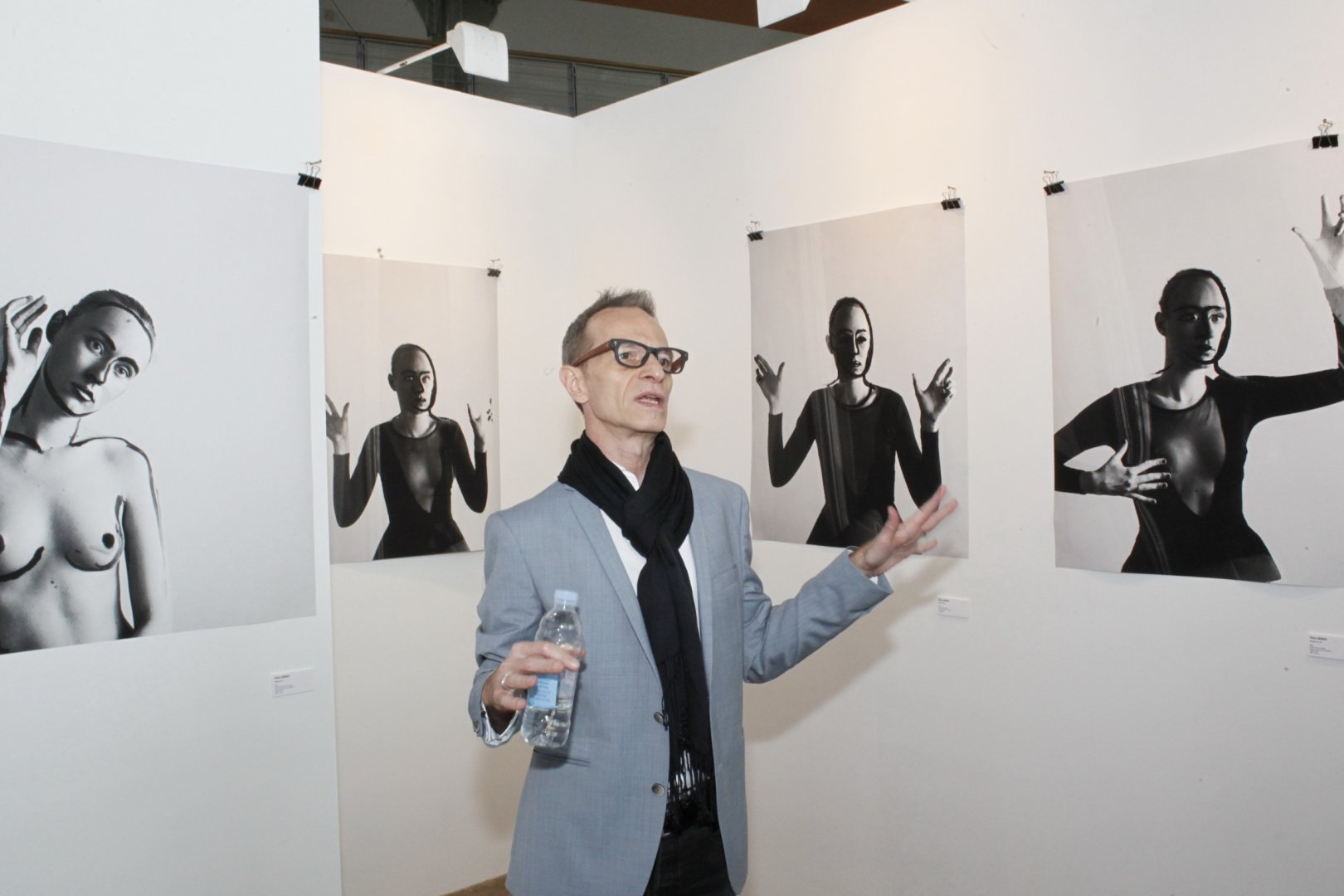 A vásár igazgatója, a nagy kommunikációs guru, Ledényi Attila a külön alegységgé duzzadt Photo Market Budapest egyik standján. (Ami történetesen az általa vezetett We Love Artists, Borsi Flóra fotóival.)