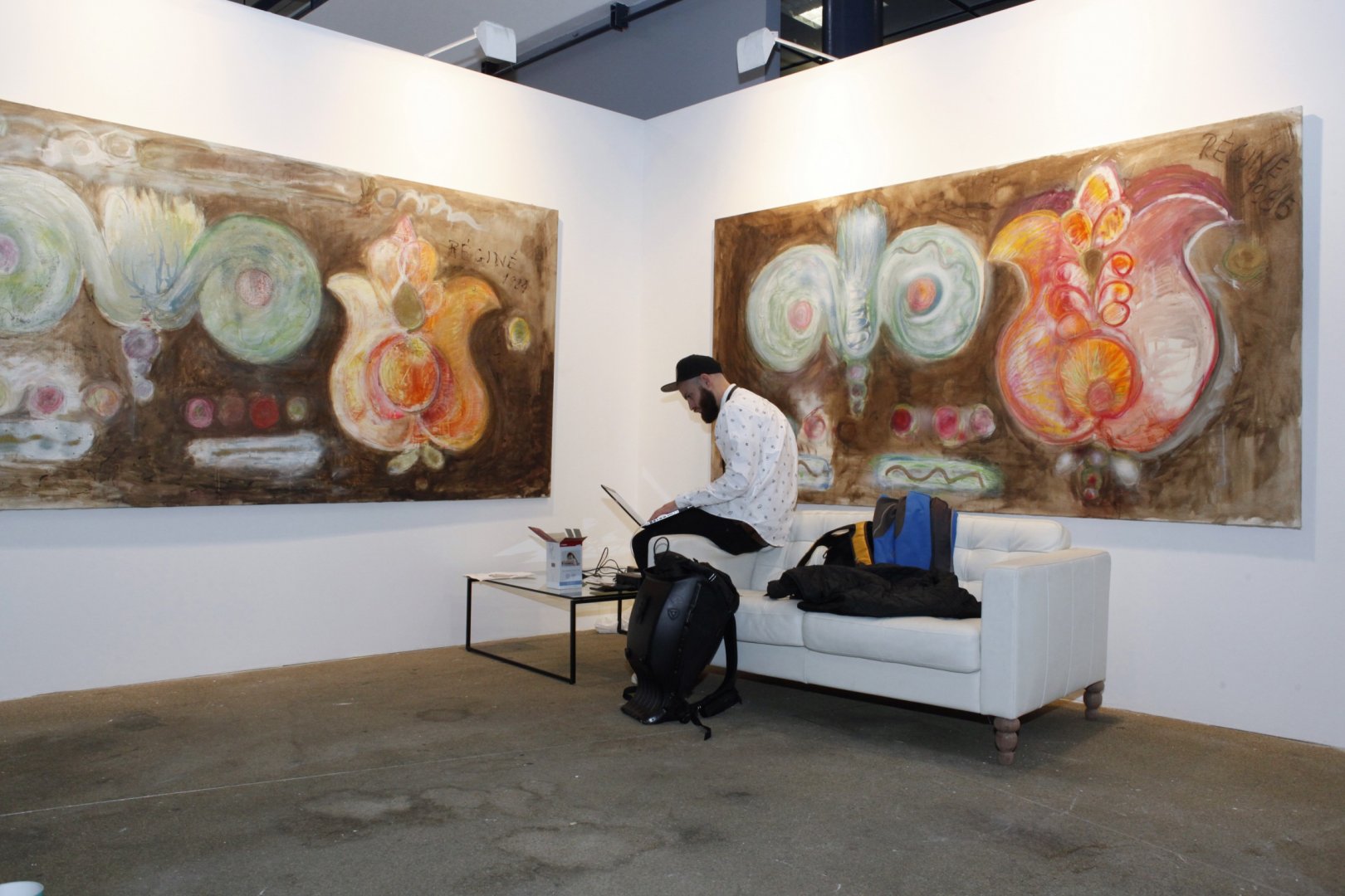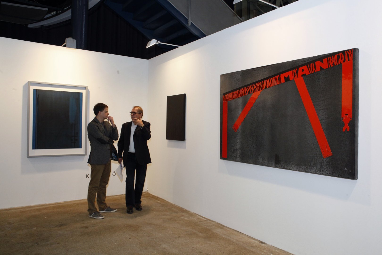 A neoavantgárd kulcsfigurájának, Erdély Miklósnak két masszív festményóriása az Art+Text standján, a galéria fotós projektjéért felelős Barnie társaságában.