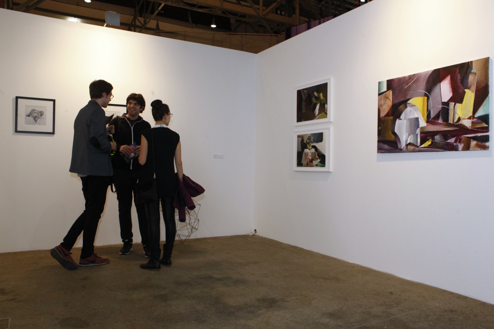 Egy idősebb és egy fiatalabb festő (Szűcs Attila és Király András) méregeti a még fiatalabb festő (Szinyova Gergő) absztrakt vásznát a Kisterem standján.