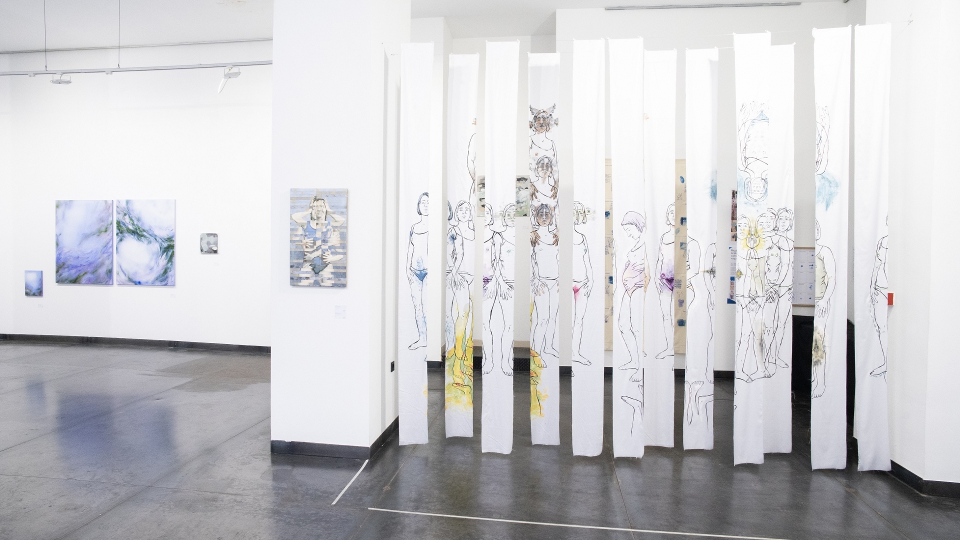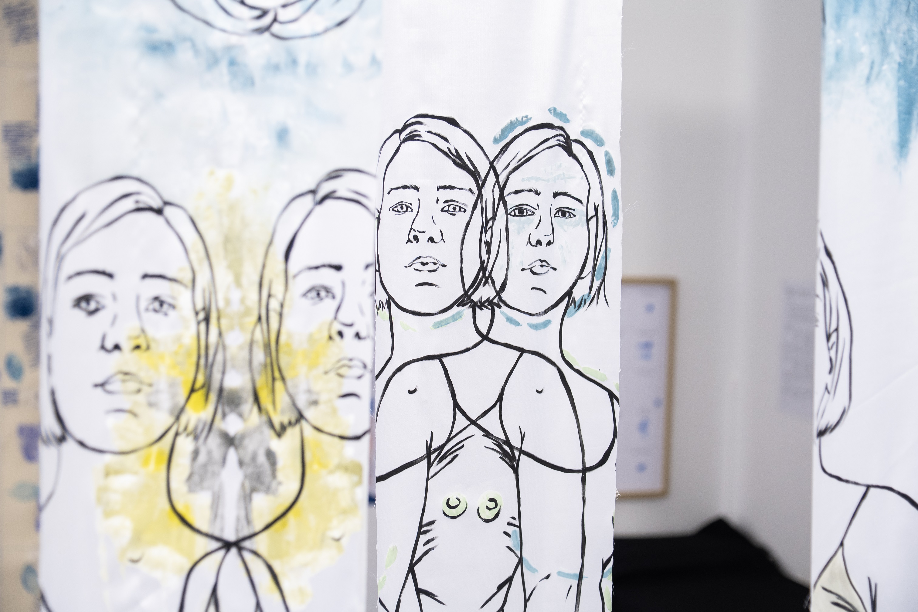 A kiállítás központi eleme az alkotók személyes és közös benyomásait vizualizáló monumentális textilmű, amely az adatvizualizációs grafikák logikáját idézi. A molinóra varrt rácsháló húsz mezője különféle fogalmakat – gyász, újrakezdés, rugalmasság, intuíció, test, megbékélés – elevenít meg, mindegyikben a művészek egyéni jeleivel és motívumaival. A jelek helye és ismétlődése az adott tapasztalat intenzitását jelzi, így a közös mű egyszerre működik személyes térképként és kollektív naplóként. Az installációhoz interaktív projekt is társul: a látogatók egy kisebb vásznon saját jeleiket helyezhetik el, így részeseivé válnak az önvizsgálat folyamatának. Az alkotás a közönség kéznyomainak hatására folyamatosan bővül és alakul, akár a bennünk zajló, állandó növekedésben lévő belső táj.