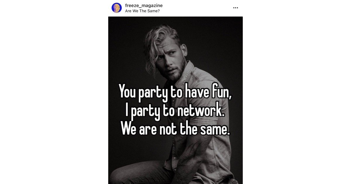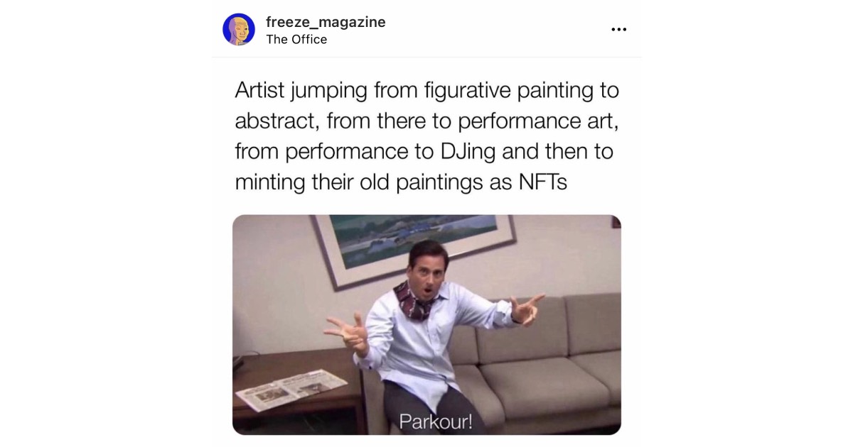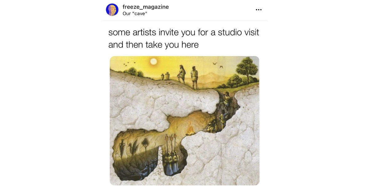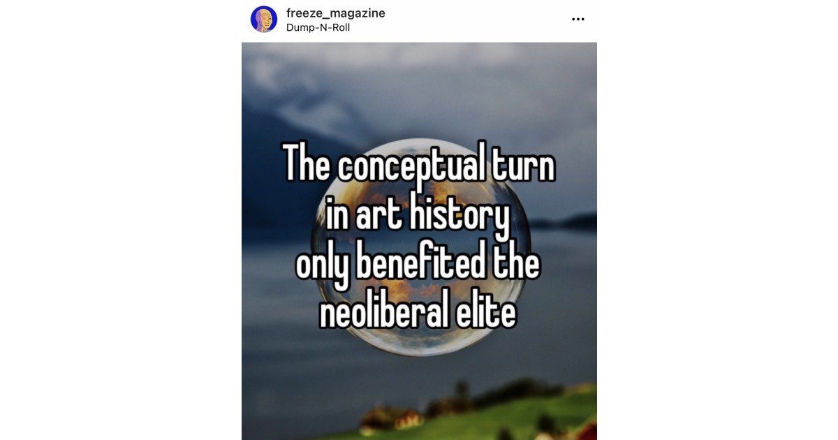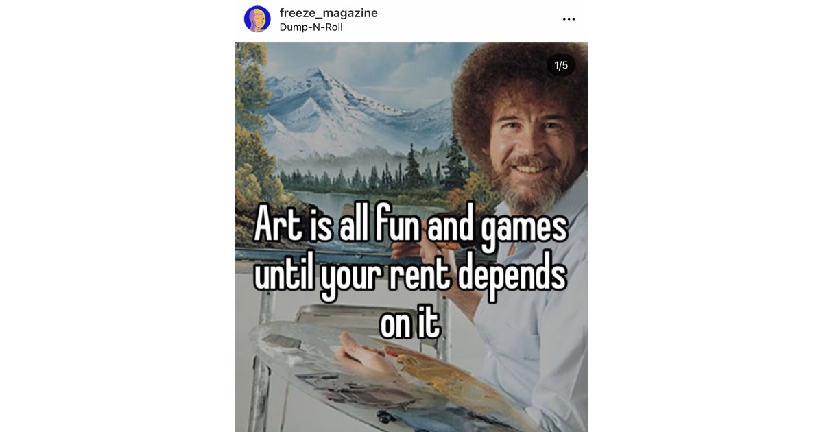 Mi sem zavarja össze jobban a művészet iránt érdeklődő embert, mint amikor a Frieze Magazinon olvas a Freeze Magazinról. WTF? Ijedtségre azonban semmi ok, nem egy végtelen loopba kerültünk, amiben művészeti magazinok már csak saját létezésükről tájékoztatnak (Bourdieu likes that)… Ami a londoni magazinnak feltűnt és annak hirtelenjében meg is írta, hogy az intézmény évtizedek óta épített márkanevét kis módosítással mások kezdték el használni, más célokra a közösségi médiában. A Freeze (sic!) Magazin, aminek az Instagramon ma már több mint 100 ezer követője van, a szó szoros értelmében nem ápol kapcsolatot világ egyik vezető művészeti orgánumával. Sőt, ahelyett, hogy bejegyzései aktuális trendekről, kiállításokról vagy művészekről szólnának, a művészet intézményrendszerét kritizálja, méghozzá az internet legvirálisabb formátumában. A mémekbe oltott művészeti szatíra ma tombol az interneten, a parodizált intézmények pedig egyelőre nem tudnak mit tenni, mint sem elfogadják, hogy ez nem nekik jutott először az eszükbe.